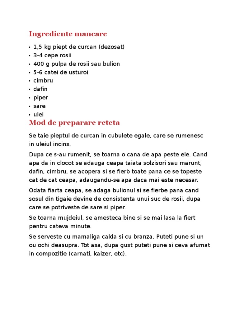 Se taie pieptul de curcan in cubulete egale, care se rumenesc in uleiul incins. Dupa ce s-au rumenit, se toarna o cana de apa peste ele. Cand apa da in clocot se adauga ceapa taiata solzisori sau marunt, dafin, cimbru, se acopera si se fierb toate pana ce se topeste cat de cat ceapa, adaugandu-se apa daca mai este necesar. Odata fiarta ceapa, se adaga bulionul si se fierbe pana cand sosul din tigaie devine de consistenta unui suc de rosii, dupa care se potriveste de sare si piper. Se toarna mujdeiul, se amesteca bine si se mai lasa la fiert pentru cateva minute. Se serveste cu mamaliga calda si cu branza. Puteti pune si un ou ochi deasupra. Tot asa, dupa gust puteti pune si ceva afumat in compozitie (carnati, kaizer, etc).