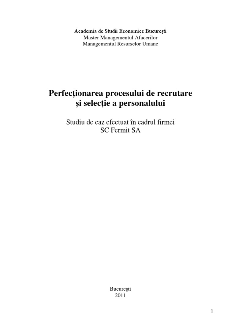 II. Studiu de caz privind recrutarea, selecia i angajarea resurselor umane la S.C. Fermit S.A ......................................................................................... 33
