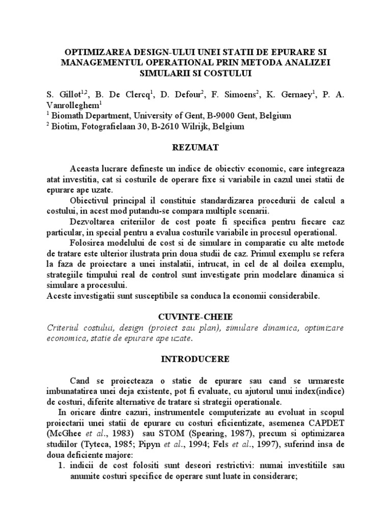 APRECIERI Acest studiu a fost finantat de Institutul Flemish pentru Promovarea Cercetarii Stiintifico-Tehnologica in Industrie din Belgia. REFERINTE Agentiile de gospodarirea apelor, Ministerul Mediului (1995). Abordari tehnico-economice ale costurilor. Investitii de [Link] tehnic, pag. 48. (in Franceza), Alexandre, O. si Grand dEsnon, A. (1998). Costul de salubritate rurala. Evaluarea costurilor de investiii i de exploatare. TSM, 7/8, 19-31. (in Franceza) ASCE (1992) ASCE Masuratori standard pentru transferul de oxigen in apa curata. Societatea Americana a Inginerilor, Balmr, P. and Mattson, B. (1994). Costurile operationale pentru o statie de epurare ape uzate, Wat. Sci. Tech. 30(4), 7-15. Brett, S. W., Morse, G. K., Lester, J. N. (1998). Cheltuieli operationale in industria apei (I) : O metodologie pentru estimarea costurilor variabile in cazul unei statii de epurare avansate. Managementul apei in context european, 1(5), 31-38. Ekster A.(1998). Controlul pierderilor automate. Wat. Env. Techn., 10 (8),63-64. Fels, M., Pintr, J., Lycon, D. S. (1997). Optimizarea design-ului pentru sistemele de tratare ape uzate Aplicarea la past mecanic i industria hrtiei: proiectare si relatii de cost. Can. J. Chem., Eng., 75, 437-451. Jacquet, P. (1999). Een globale kostenfunctie voor tuning en evaluatie van op respirometrie gebaseerde controle algoritmen voor actiefslibprocessen. Engineers Thesis. Faculty of Agricultural and Applied Biological Sciences. University Gent, Belgium. pp. 122. (in Dutch) McGhee, T. J., Mojgani, P., Viicidomina, F. (1983). Use of EPAs CAPDET program for evaluation of wastewater treatment alternatives. J. Water Pollut. Control Fed., 55(1), 35-43. Pipyn, P., Derycke, D., Defour, D. (1994). Sludge production and treatment as important factors in the cost/benefit calculation in the choice of the most appropriate wastewater treatment plant system . Med. Fac. Landbouww., Univ. Gent, 59, 1951-1958. Rivas A. and Ayesa E.(1997). Optimum design of activated sludge plants using the simulator DAISY