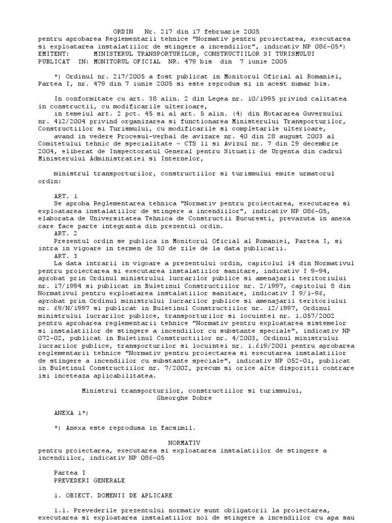 217 din 17 februarie 2005 pentru aprobarea Reglementarii tehnice "Normativ pentru proiectarea, executarea si exploatarea instalatiilor de stingere a incendiilor", indicativ NP 086-05*) EMITENT: MINISTERUL TRANSPORTURILOR, CONSTRUCTIILOR SI TURISMULUI PUBLICAT IN: MONITORUL OFICIAL NR. 479 bis din 7 iunie 2005 *) Ordinul nr. 217/2005 a fost publicat in Monitorul Oficial al Romaniei, Partea I, nr. 479 din 7 iunie 2005 si este reprodus si in acest numar bis. In conformitate cu art. 38 alin. 2 din Legea nr. 10/1995 privind calitatea in constructii, cu modificarile ulterioare, in temeiul art. 2 pct. 45 si al art. 5 alin. (4) din Hotararea Guvernului nr. 412/2004 privind organizarea si functionarea Ministerului Transporturilor, Constructiilor si Turismului, cu modificarile si completarile ulterioare, avand in vedere Procesul-verbal de avizare nr. 40 din 28 august 2003 al Comitetului tehnic de specialitate - CTS 11 si Avizul nr. 7 din 29 decembrie 2004, eliberat de Inspectoratul General pentru Situatii de Urgenta din cadrul Ministerului Administratiei si Internelor, ministrul transporturilor, constructiilor si turismului emite urmatorul ordin: ART. 1 Se aproba Reglementarea tehnica "Normativ pentru proiectarea, executarea si exploatarea instalatiilor de stingere a incendiilor", indicativ NP 086-05, elaborata de Universitatea Tehnica de Constructii Bucuresti, prevazuta in anexa care face parte integranta din prezentul ordin. ART. 2 Prezentul ordin se publica in Monitorul Oficial al Romaniei, Partea I, si intra in vigoare in termen de 30 de zile de la data publicarii. ART. 3 La data intrarii in vigoare a prezentului ordin, capitolul 14 din Normativul pentru proiectarea si executarea instalatiilor sanitare, indicativ I 9-94, aprobat prin Ordinul ministrului lucrarilor publice si amenajarii teritoriului nr. 17/1994 si publicat in Buletinul Constructiilor nr. 2/1997, capitolul 8 din Normativul pentru exploatarea instalatiilor sanitare, indicativ I 9/1-96, aprobat prin Ordinul ministrului lucrarilor publice si amenajarii teritoriului nr. 69/N/1997 si publicat in Buletinul Constructiilor nr. 12/1997, Ordinul ministrului lucrarilor publice, transporturilor si locuintei nr. 1.057/2002 pentru aprobarea reglementarii tehnice "Normativ pentru exploatarea sistemelor si instalatiilor de stingere a incendiilor cu substante speciale", indicativ NP 072-02, publicat in Buletinul Constructiilor nr. 4/2003, Ordinul ministrului lucrarilor publice, transporturilor si locuintei nr. 1.619/2001 pentru aprobarea reglementarii tehnice "Normativ pentru proiectarea si executarea instalatiilor de stingere a incendiilor cu substante speciale", indicativ NP 052-01, publicat in Buletinul Constructiilor nr. 7/2002, precum si orice alte dispozitii contrare isi inceteaza aplicabilitatea. Ministrul transporturilor, constructiilor si turismului, Gheorghe Dobre ANEXA 1*) *) Anexa este reprodusa in facsimil. NORMATIV pentru proiectarea, executarea si exploatarea instalatiilor de stingere a incendiilor, indicativ NP 086-05 Partea I PREVEDERI GENERALE 1. OBIECT. DOMENII DE APLICARE 1.1. Prevederile prezentului normativ sunt obligatorii la proiectarea, executarea si exploatarea instalatiilor noi de stingere a incendiilor cu apa sau