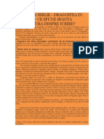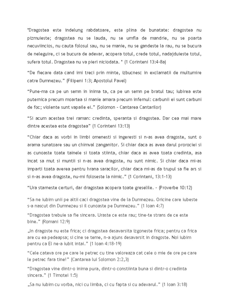 nu cauta folosul sau, nu se manie, nu se gandeste la rau, nu se bucura de neleguire, ci se bucura de adevar, acopera totul, crede totul, nadajduieste totul, sufera totul. Dragostea nu va pieri niciodata. " (1 Corinteni 13:4-8a) De fiecare data cand imi treci prin minte, izbucnesc in exclamatii de multumire catre Dumnezeu. (Filipeni 1:3; Apostolul Pavel) Pune-ma ca pe un semn in inima ta, ca pe un semn pe bratul tau; iubirea este puternica precum moartea si manie amara precum infernul: carbunii ei sunt carbuni de foc; violente sunt vapaile ei. (Solomon Cantarea Cantarilor) Si acum acestea trei raman: credinta, speranta si dragostea. Dar cea mai mare dintre acestea este dragostea (1 Corinteni 13:13) Chiar daca as vorbi in limbi omenesti si ingeresti si n-as avea dragoste, sunt o arama sunatoare sau un chimval zanganitor. Si chiar daca as avea darul prorociei si as cunoaste toate tainele si toata stiinta, chiar daca as avea toata credinta, asa incat sa mut si muntii si n-as avea dragoste, nu sunt nimic. Si chiar daca mi-as imparti toata averea pentru hrana saracilor, chiar daca mi-as da trupul sa fie ars si si n-as avea dragoste, nu-mi foloseste la nimic. (1 Corinteni, 13:1-13) Ura starneste certuri, dar dragostea acopera toate greselile. (Proverbe 10:12) Sa ne iubim unii pe altii caci dragostea vine de la Dumnezeu. Oricine care iubeste s-a nascut din Dumnezeu si il cunoaste pe Dumnezeu. (1 Ioan 4:7) Dragostea trebuie sa fie sincera. Uraste ce este rau; tine-te strans de ce este bine. (Romani 12:9) In dragoste nu este frica; ci dragostea desavarsita izgoneste frica; pentru ca frica are cu ea pedeapsa; si cine se teme, n-a ajuns desavarsit in dragoste. Noi iubim pentru ca El ne-a iubit intai. (1 Ioan 4:18-19) Cele cateva ore pe care le petrec cu tine valoreaza cat cele o mie de ore pe care le petrec fara tine! (Cantarea lui Solomon 2:2,3) Dragostea vine dintr-o inima pura, dintr-o constiinta buna si dintr-o credinta sincera. (1 Timotei 1:5) Sa nu iubim cu vorba, nici cu limba, ci cu fapta si cu adevarul. (1 Ioan 3:18)
