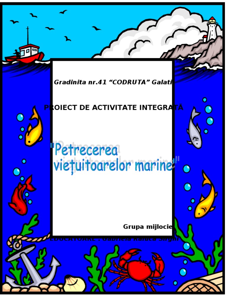 TEMA ANUAL: Cnd,cum i de ce se ntmpl TEMA PROIECTULUI: Vieuitoarele Pmntului TEMA SPTMNII: Lumea mrilor i a oceanelor SUBIECTUL ZILEI: Petrecerea vieuitoarelor marine TIPUL ACTIVITII: Consolidarea i sistematizarea cunotinelor, priceperilor i deprinderilor FORM DE ORGANIZARE: mixt SCOPUL: Imbogatirea vocabularului activ si pasiv pe baza experientei activitatilor personale si a relatiilor cu ceilalti; Cultivarea calitatilor de vointa si caracter cum sunt initiativa, perseverenta, harnicia, spiritul de cooperare cu alti copii; Participarea la activitile de grup, inclusiv la activitile de joc, att n calitate de vorbitor, ct i n calitate de auditor; nsuirea i folosirea elementelor de limbaj plastic. Dezvoltarea imaginaiei creatoare, a sensibilitii i a simului estetic. Dezvoltarea motricitii manuale: a muchilor mici ai minilor;