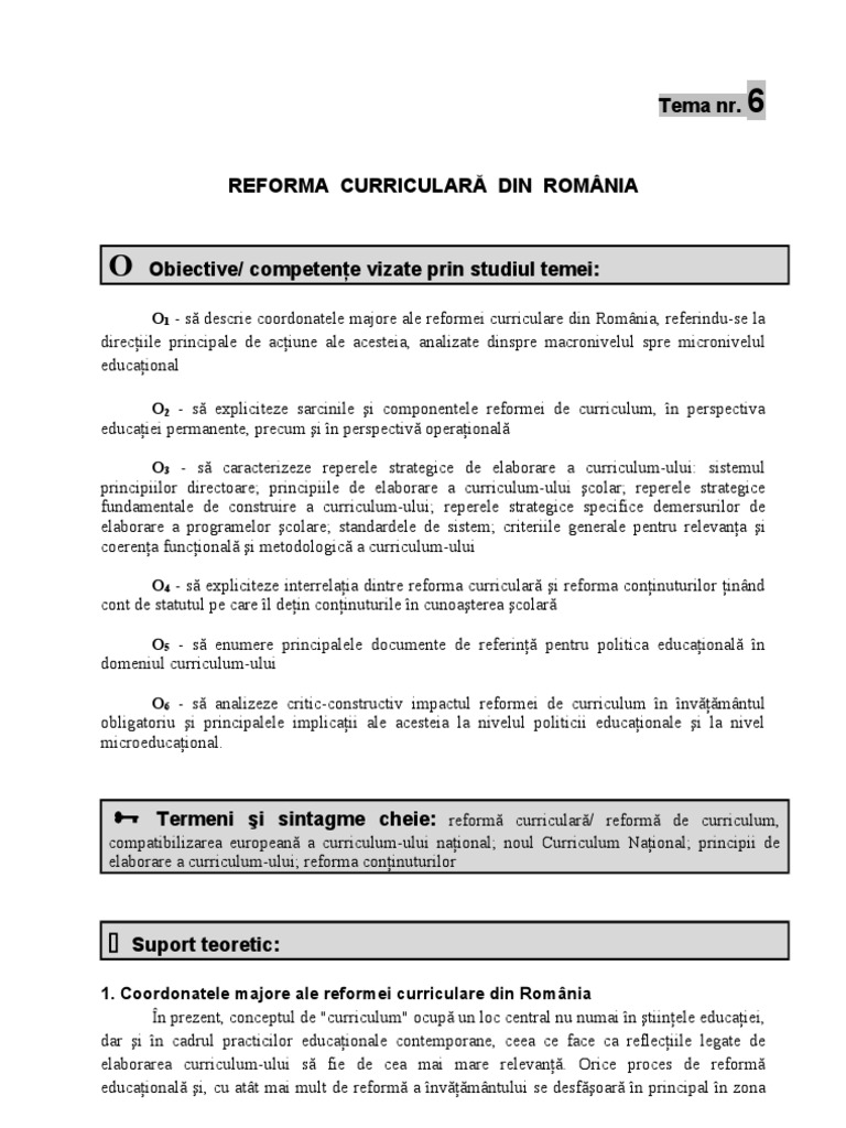 O1 - s descrie coordonatele majore ale reformei curriculare din Romnia, referindu-se la direciile principale de aciune ale acesteia, analizate dinspre macronivelul spre micronivelul educaional O2 - s expliciteze sarcinile i componentele reformei de curriculum, n perspectiva educaiei permanente, precum i n perspectiv operaional O3 - s caracterizeze reperele strategice de elaborare a curriculum-ului: sistemul principiilor directoare; principiile de elaborare a curriculum-ului colar; reperele strategice fundamentale de construire a curriculum-ului; reperele strategice specifice demersurilor de elaborare a programelor colare; standardele de sistem; criteriile generale pentru relevana i coerena funcional i metodologic a curriculum-ului O4 - s expliciteze interrelaia dintre reforma curricular i reforma coninuturilor innd cont de statutul pe care l dein coninuturile n cunoaterea colar O5 - s enumere principalele documente de referin pentru politica educaional n domeniul curriculum-ului O6 - s analizeze critic-constructiv impactul reformei de curriculum n nvmntul obligatoriu i principalele implicaii ale acesteia la nivelul politicii educaionale i la nivel microeducaional.