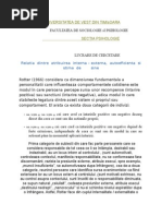 tigari pe zi. Nu vom spune vreau sa studiez mai mult, ci vreau sa studiez 4 ore, zilnic, vreau sa-mi spun de fiecare data punctul de vedere asupra unei probleme importante n loc de vreau sa fiu mai asertiv. Cu ct scopul, nivelul dezirabil al comportamentului tinta este formulat mai vag, cu att mai mare probabilitatea de a abandona autocontrolul lui. n plus, un scop formulat n termeni precisi, cantitativi, ne ofera posibilitatea de a avea feed-back-uri clare despre eficacitatea autocontrolului si de a -l recalibra, atunci cnd e cazul. Iata cteva recomandari suplimentare: a) descrieti explicit scopul pe care vreti sa-l atingeti, exprimndu-l n termeni cantitativi; b) reflectati asupra corectitudinii formularii; c) descrieti prin ce veti sti ca v-ati atins sau nu scopul; d) presupunnd ca altcineva si propune acelasi scop, cum sti daca si-a atins sau nu scopul; e) faceti o lista cu comportamentele care, daca ar fi realizate, v-ar face sa va atingeti scopul; f) daca scopul pe care vi-l propuneti e mai greu de atins, descompuneti-l n subscopuri, care pot fi realizate secvential. Va propuneti apoi sa realizati doar aceste subscopuri, pe rnd, secvential. Treceti la realizarea urmatorului obiectiv abia dupa ce l-ati atins pe cel anterior; g) faceti o lista cu comportamentele care interfereaza, adica mpiedica realizarea scopului pe care vi l-ati propus. ncercati eliminarea sau reducerea lor. Pe scurt, problema trebuie dezambiguizata pentru a putea fi abordata cu succes. Formularile vagi, de genul as vrea sa fiu mai calm, as vrea sa fiu mai silitor creeaza senzatia de nestiinta, de neputinta si necontrolabilitate. Intentiile bune formulate vag, mor repede. 2. Faceti un angajament de schimbare. Dupa cum se stie angajamentul are o puternica functia motivationala, care trebuie mobilizata n realizarea autocontrolului. Ca atare: a) faceti public angajamentul (scrieti-le prietenilor, declarati intentia de schimbare n fata unor persoane semnificative pentru dumneavoastra etc.); b) reorganizati mediul astfel nct sa va aminteasca mereu ca aveti un obiectiv n controlul propriului comportament (ex.: puneti pe birou graficul cu exercitiile fizice p e care le faceti, obiectivul pe care trebuie sa-l atingeti pe saptamna n curs, afisati biletele, care sa va aminteasca ce si cnd aveti de facut, scrieti n agenda etc.); c) cautati sa obtineti suport social pentru schimbare (ex.: faceti apel la familie, prieteni, persoane cu experienta, care sa va ajute n realizarea obiectivelor, sa va ntareasca comportamentele pozitive, sa va atraga atentia asupra sarcinii etc.);