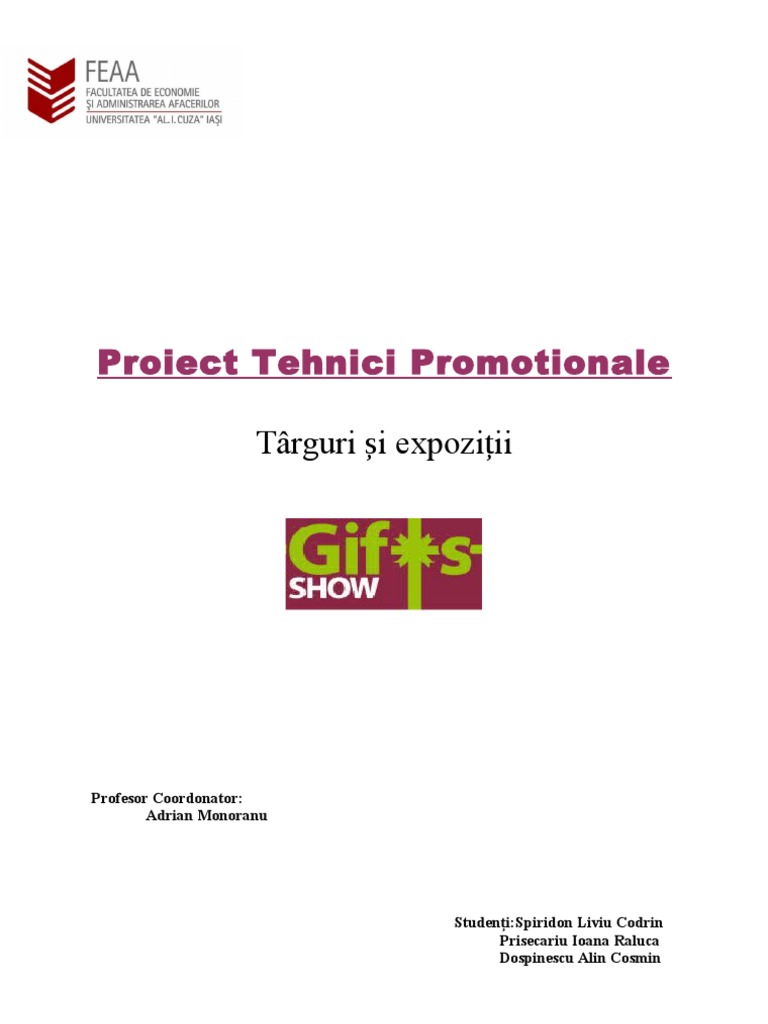 . [Link] strategiei de participare la tg/expo ROMEXPO este pentru noi un bun prilej de a realiza noi contracte de parteneriat cu firme atat din ar ct i din strinatate. Trgurile reprezint piee organizate n locuri dinainte stabilite i n perioade limitate de timp, avnd obiective promoionale i de comercializare. Ele cunosc o mare dezvoltare n afacerile economice contemporane, n condiiile n care are loc extinderea i a altor manifestri promoionale. Conform Camerei Internaionale de Comer, trgurile internaionale se definesc ca mari piee cu periodicitate regulat i care au drept scop s permit participanilor din toate rile s prezinte mostre ale produciilor, realizri noi i perfecionri tehnice, n vederea efecturii de tranzacii comerciale pe plan intern i internaional. Vor exista spatii special amenajate pentru testarea produselor atat de ctre potenialii clieni ct si de cumpratorii fideli. Ca tehnic promoional am ales concursul cu tombol, aceasta fiind cea mai potrivit dintre toate deoarece creeaz n primul rnd un grad ridicat de notorietate i nu n ultimul rnd are rolul de a atrage clieni.