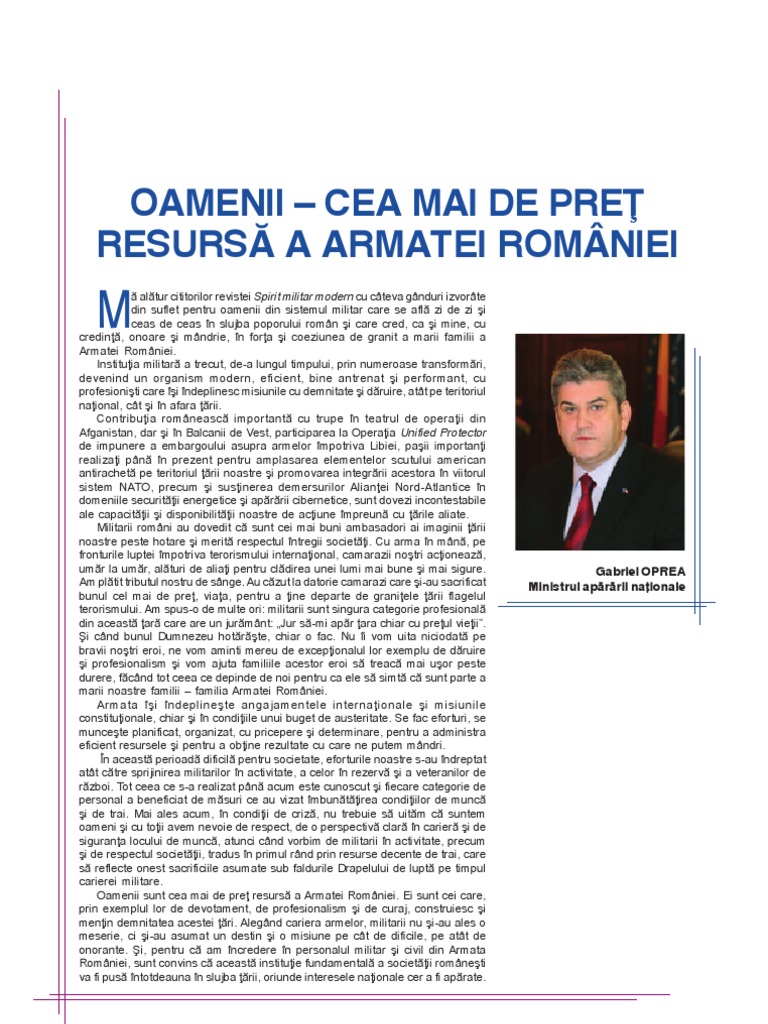 ` al`tur cititorilor revistei Spirit militar modern cu cteva gnduri izvorte din suflet pentru oamenii din sistemul militar care se afl` zi de zi [i ceas de ceas n slujba poporului romn [i care cred, ca [i mine, cu credin]`, onoare [i mndrie, n for]a [i coeziunea de granit a marii familii a Armatei Romniei. Institu]ia militar` a trecut, de-a lungul timpului, prin numeroase transform`ri, devenind un organism modern, eficient, bine antrenat [i performant, cu profesioni[ti care [i ndeplinesc misiunile cu demnitate [i d`ruire, att pe teritoriul na]ional, ct [i n afara ]`rii. Contribu]ia romneasc` important` cu trupe n teatrul de opera]ii din Afganistan, dar [i n Balcanii de Vest, participarea la Opera]ia Unified Protector de impunere a embargoului asupra armelor mpotriva Libiei, pa[ii importan]i realiza]i pn` n prezent pentru amplasarea elementelor scutului american antirachet` pe teritoriul ]`rii noastre [i promovarea integr`rii acestora n viitorul sistem NATO, precum [i sus]inerea demersurilor Alian]ei Nord-Atlantice n domeniile securit`]ii energetice [i ap`r`rii cibernetice, sunt dovezi incontestabile ale capacit`]ii [i disponibilit`]ii noastre de ac]iune mpreun` cu ]`rile aliate. Militarii romni au dovedit c` sunt cei mai buni ambasadori ai imaginii ]`rii noastre peste hotare [i merit` respectul ntregii societ`]i. Cu arma n mn`, pe fronturile luptei mpotriva terorismului interna]ional, camarazii no[tri ac]ioneaz`, um`r la um`r, al`turi de alia]i pentru cl`direa unei lumi mai bune [i mai sigure. Am pl`tit tributul nostru de snge. Au c`zut la datorie camarazi care [i-au sacrificat bunul cel mai de pre], via]a, pentru a ]ine departe de grani]ele ]`rii flagelul terorismului. Am spus-o de multe ori: militarii sunt singura categorie profesional` din aceast` ]ar` care are un jur`mnt: Jur s`-mi ap`r ]ara chiar cu pre]ul vie]ii. {i cnd bunul Dumnezeu hot`r`[te, chiar o fac. Nu i vom uita niciodat` pe bravii no[tri eroi, ne vom aminti mereu de excep]ionalul lor exemplu de d`ruire [i profesionalism [i vom ajuta familiile acestor eroi s` treac` mai u[or peste durere, f`cnd tot ceea ce depinde de noi pentru ca ele s` simt` c` sunt parte a marii noastre familii familia Armatei Romniei. Armata [i ndepline[te angajamentele interna]ionale [i misiunile constitu]ionale, chiar [i n condi]iile unui buget de austeritate. Se fac eforturi, se munce[te planificat, organizat, cu pricepere [i determinare, pentru a administra eficient resursele [i pentru a ob]ine rezultate cu care ne putem mndri. n aceast` perioad` dificil` pentru societate, eforturile noastre s-au ndreptat att c`tre sprijinirea militarilor n activitate, a celor n rezerv` [i a veteranilor de r`zboi. Tot ceea ce s-a realizat pn` acum este cunoscut [i fiecare categorie de personal a beneficiat de m`suri ce au vizat mbun`t`]irea condi]iilor de munc` [i de trai. Mai ales acum, n condi]ii de criz`, nu trebuie s` uit`m c` suntem oameni [i cu to]ii avem nevoie de respect, de o perspectiv` clar` n carier` [i de siguran]a locului de munc`, atunci cnd vorbim de militarii n activitate, precum [i de respectul societ`]ii, tradus n primul rnd prin resurse decente de trai, care s` reflecte onest sacrificiile asumate sub faldurile Drapelului de lupt` pe timpul carierei militare. Oamenii sunt cea mai de pre] resurs` a Armatei Romniei. Ei sunt cei care, prin exemplul lor de devotament, de profesionalism [i de curaj, construiesc [i men]in demnitatea acestei ]`ri. Alegnd cariera armelor, militarii nu [i-au ales o meserie, ci [i-au asumat un destin [i o misiune pe ct de dificile, pe att de onorante. {i, pentru c` am ncredere n personalul militar [i civil din Armata Romniei, sunt convins c` aceast` institu]ie fundamental` a societ`]ii romne[ti va fi pus` ntotdeauna n slujba ]`rii, oriunde interesele na]ionale cer a fi ap`rate.