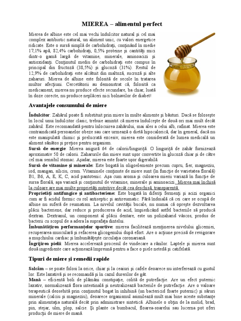Mierea de albine este cel mai vechi ndulcitor natural i cel mai complex antibiotic natural, un aliment unic, cu valori energetice ridicate. Este o surs simpl de carbohidrai, coninnd n medie 17,1% ap, 82,4% carbohidrai, 0,5% proteine i cantiti mici dintr-o gam larg de vitamine, minerale, aminoacizi i antioxidani. Coninutul mediu de carbohidrai este compus n principal din fructoz (38,5%) i glucoz (31%). Restul de 12,9% de carbohidrai este alctuit din maltoz, sucroz i alte zaharuri. Mierea de albine este folosit de secole n tratarea multor afeciuni. Cercettorii au demonstrat c, folosit ca medicament, mierea nu produce efecte secundare, ba chiar, luat n doze corecte, nu produce neplceri nici bolnavilor de diabet!