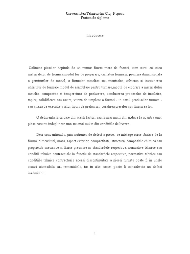 Calitatea pieselor depinde de un numar foarte mare de factori, cum sunt: calitatea materialelor de formare,modul lor de preparare, calitatea formarii, precizia dimensionala a garniturilor de model, a formelor metalice sau matritelor, calitatea si intretinerea utilajului de formare,modul de asamblare pentru turnare,modul de elborare a materialului metalic, compozitia si temperatura de prelucrare, conducerea proceselor de incalzire, topire, solidificare sau racire, viteza de umplere a formei - in cazul produselor turnate sau viteza de executie a altor tipuri de prelucrari, curatirea pieselor sau finisarea lor. O deficienta la oricare din acesti factori sau la mai multi din ei,duce la aparitia unor piese care nu indeplinesc una sau mai multe din conditiile de livrare. Desi conventionala, prin notiunea de defect a piesei, se intelege orice abatere de la forma, dimensiuni, masa, aspect exterior, compactitate, structura, compozitie chimica sau proprietati mecanice si fizice prescrise in standardele respective, normative tehnice sau conditii tehnice [Link] functie de standardele respective, normative tehnice sau conditiile tehnice contractuale aceasi discontinuitate a piesei turnate poate fi in unele cazuri admisibila sau remaniabila, iar in alte cazuri poate fi considerata un defect inadmisibil.