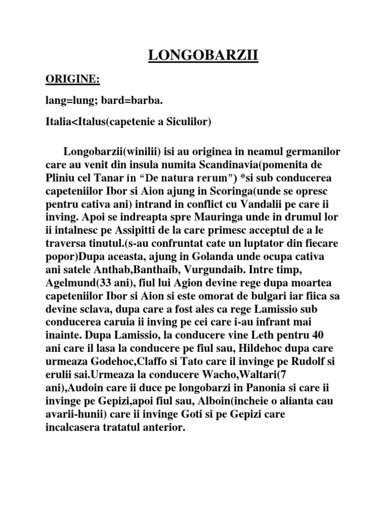 ORIGINE: lang=lung; bard=barba. Italia<Italus(capetenie a Siculilor) Longobarzii(winilii) isi au originea in neamul germanilor care au venit din insula numita Scandinavia(pomenita de Pliniu cel Tanar in De natura rerum) *si sub conducerea capeteniilor Ibor si Aion ajung in Scoringa(unde se opresc pentru cativa ani) intrand in conflict cu Vandalii pe care ii inving. Apoi se indreapta spre Mauringa unde in drumul lor ii intalnesc pe Assipitti de la care primesc acceptul de a le traversa tinutul.(s-au confruntat cate un luptator din fiecare popor)Dupa aceasta, ajung in Golanda unde ocupa cativa ani satele Anthab,Banthaib, Vurgundaib. Intre timp, Agelmund(33 ani), fiul lui Agion devine rege dupa moartea capeteniilor Ibor si Aion si este omorat de bulgari iar fiica sa devine sclava, dupa care a fost ales ca rege Lamissio sub conducerea caruia ii inving pe cei care i-au infrant mai inainte. Dupa Lamissio, la conducere vine Leth pentru 40 ani care il lasa la conducere pe fiul sau, Hildehoc dupa care urmeaza Godehoc,Claffo si Tato care il invinge pe Rudolf si erulii [Link] la conducere Wacho,Waltari(7 ani),Audoin care ii duce pe longobarzi in Panonia si care ii invinge pe Gepizi,apoi fiul sau, Alboin(incheie o alianta cau avarii-hunii) care ii invinge Goti si pe Gepizi care incalcasera tratatul anterior.