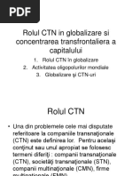 reprezentati de chiar functiile lantului valorii globale (conceptia produsului, cercetaredezvoltare, productie, marketing, logistica-distributie, vanzare, servicii post-vanzare). Strategiile de arbitraj capata o importanta crescuta, dar ele se particularizeaza intr-un mod aparte in cazul arbitrajului ofertei de factori de productie clasici si al arbitrajului ofertei de functii. 4. Care este continutul actual al globalizarii economice din punctual de vedere al strategiilor adoptate de companii. Actualizarea continutului globalizarii economice apare ca o cerinta metodologica in contextul in care noutatile economice confirma, in ultimul deceniu consolidarea unor relatii de tip nou intre firme bazate pe specializarea lor functionala. Noile realitati se cer dezvaluite si definite inclusiv printr-o terminologie care sa favorizeze decantarea elementelor de noutate intr-un moment in care structurile de organizare si functionare a companiilor sunt nu numai extrem de diversificate, dar se si remodeleaza intr-un ritm foarte rapid. Delimitarea companiilor ca fiind multinationale sau transnationale a capacitat in decursul timpului destul de multi cercetatori si institutii. Dar aceasta delimitare trebuie sa aiba la baza strategiile adoptate de firme, care la randul lor se grefeaza pe un anumit context mondoeconomic. Aparitia unei dimensiuni calitativ noi a acestui context mondoeconomic, definite prin doua coordonate principale, specializarea functionala si reconfigurarea politico-economica internationala, este insa de natura sa remodeleze structurile si strategiile, pe care se sprijina in plan national sau international, activitatea companiilor. Pentru a realiza o afiliere mai facila a unor companii la o anume strategie, putem adopta urmatoarea terminologie: a) Companii multinationale (CMN) acele companii care mizeaza preponderant pe strategia de adaptare la specificul cererii din fiecare tara, rezultand o implicare in n moduri ajustate corespunzator celor n tari in care isi dezvolta activitatile (deci o prezenta multi-national). b) Companii transnationale (CTN) companiile care reusesc sa se adapteze printr-o oferta standardizata compatibila cu cererea din mai multe tari, constituind structuri organizate care sa se plieze deasupra acestui grup de natiuni (deci trans-national). Strategiile de agregare ale factorilor clasici de productie nu sunt ignorate de nici una dintre cele doua tipuri de companii. c) Companii integrate global (CIG) companiile implicate in specializarea functionala internationala, care se afla in postura de cedent de functii sau integrator de functii din lantul global al valorii unui produs sau serviciu tranzactionabil. Termenul integrator sugereaza integrarea in sfera proprie de activitate a uneia sau mai multor functii, in conditiile in care cel putin o functie ramane externalizata. Termenul global indica localizarea realizarii functiilor in cel putin doua tari. De mentionat, insa, ca specializarea functionala poate functiona la fel de bine si pe plan national, executarea functiilor rezultate din modularizarea lantului valorii fiind alocata unor protagonisti autohtoni, fara a exclude arbitrajul. O companie care isi pastreaza in interior toate functiile este o CMN sau o CTN. O CMN sau o CTN se poate transforma intr-o CIG prin externalizarea unor functii (outsourcing international sau offshoring). De asemenea, o CIG poate reveni la statutul de CMN