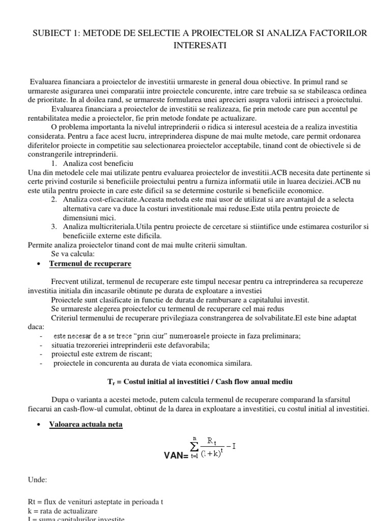 SUBIECT 1: METODE DE SELECTIE A PROIECTELOR SI ANALIZA FACTORILOR INTERESATI