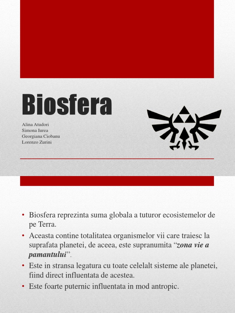 Biosfera reprezinta suma globala a tuturor ecosistemelor de pe Terra. Aceasta contine totalitatea organismelor vii care traiesc la suprafata planetei, de aceea, este supranumita zona vie a pamantului. Este in stransa legatura cu toate celelalt sisteme ale planetei, fiind direct influentata de acestea. Este foarte puternic influentata in mod antropic.