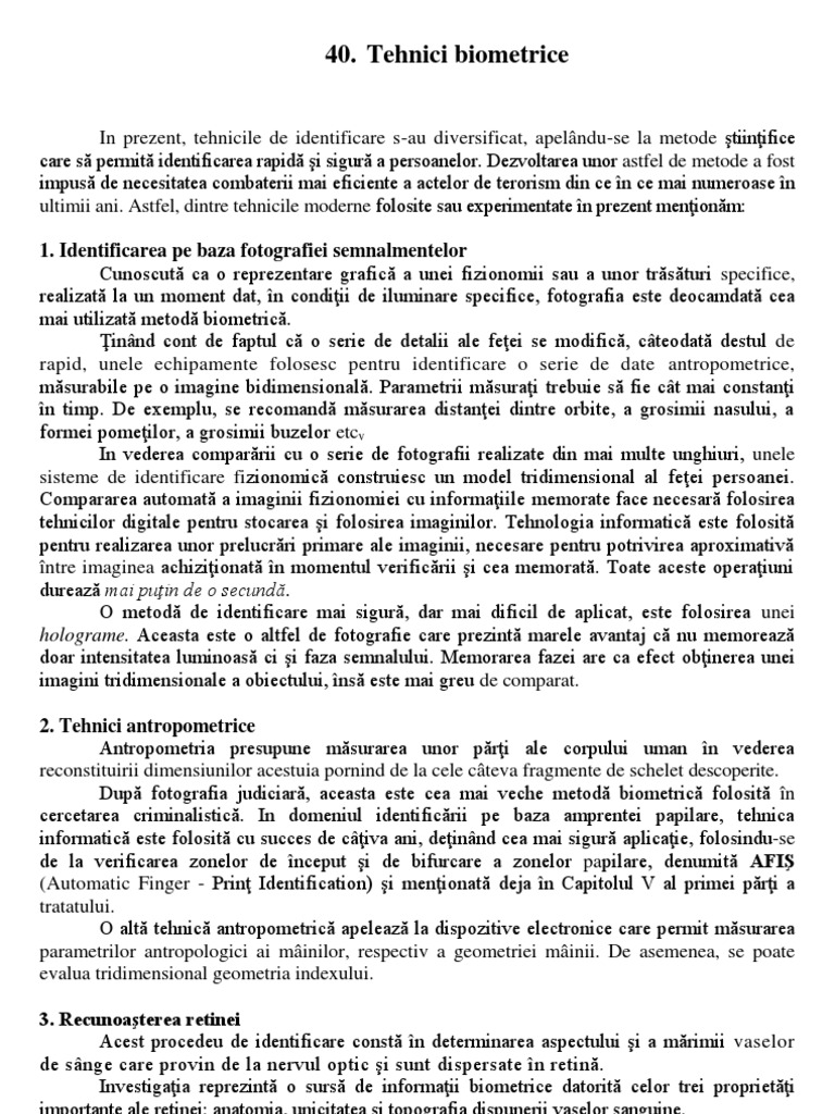 In prezent, tehnicile de identificare s-au diversificat, apelndu-se la metode tiinifice care s permit identificarea rapid i sigur a persoanelor. Dezvoltarea unor astfel de metode a fost impus de necesitatea combaterii mai eficiente a actelor de terorism din ce n ce mai numeroase n ultimii ani. Astfel, dintre tehnicile moderne folosite sau experimentate n prezent menionm: 1. Identificarea pe baza fotografiei semnalmentelor Cunoscut ca o reprezentare grafic a unei fizionomii sau a unor trsturi specifice, realizat la un moment dat, n condiii de iluminare specifice, fotografia este deocamdat cea mai utilizat metod biometric. innd cont de faptul c o serie de detalii ale feei se modific, cteodat destul de rapid, unele echipamente folosesc pentru identificare o serie de date antropometrice, msurabile pe o imagine bidimensional. Parametrii msurai trebuie s fie ct mai constani n timp. De exemplu, se recomand msurarea distanei dintre orbite, a grosimii nasului, a formei pomeilor, a grosimii buzelor etcv In vederea comparrii cu o serie de fotografii realizate din mai multe unghiuri, unele sisteme de identificare fizionomic construiesc un model tridimensional al feei persoanei. Compararea automat a imaginii fizionomiei cu informaiile memorate face necesar folosirea tehnicilor digitale pentru stocarea i folosirea imaginilor. Tehnologia informatic este folosit pentru realizarea unor prelucrri primare ale imaginii, necesare pentru potrivirea aproximativ ntre imaginea achiziionat n momentul verificrii i cea memorat. Toate aceste operaiuni dureaz mai puin de o secund. O metod de identificare mai sigur, dar mai dificil de aplicat, este folosirea unei holograme. Aceasta este o altfel de fotografie care prezint marele avantaj c nu memoreaz doar intensitatea luminoas ci i faza semnalului. Memorarea fazei are ca efect obinerea unei imagini tridimensionale a obiectului, ns este mai greu de comparat. 2. Tehnici antropometrice Antropometria presupune msurarea unor pri ale corpului uman n vederea reconstituirii dimensiunilor acestuia pornind de la cele cteva fragmente de schelet descoperite. Dup fotografia judiciar, aceasta este cea mai veche metod biometric folosit n cercetarea criminalistic. In domeniul identificrii pe baza amprentei papilare, tehnica informatic este folosit cu succes de civa ani, deinnd cea mai sigur aplicaie, folosindu-se de la verificarea zonelor de nceput i de bifurcare a zonelor papilare, denumit AFI (Automatic Finger - Prin Identification) i menionat deja n Capitolul V al primei pri a tratatului. O alt tehnic antropometric apeleaz la dispozitive electronice care permit msurarea parametrilor antropologici ai minilor, respectiv a geometriei minii. De asemenea, se poate evalua tridimensional geometria indexului. 3. Recunoaterea retinei Acest procedeu de identificare const n determinarea aspectului i a mrimii vaselor de snge care provin de la nervul optic i sunt dispersate n retin. Investigaia reprezint o surs de informaii biometrice datorit celor trei proprieti importante ale retinei: anatomia, unicitatea i topografia dispunerii vaselor sanguine.