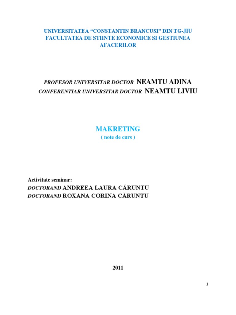 creeaz, menine i ridic standardul de via, el fiind un proces social i managerial complex prin care se creeaz i se ofer produsele i serviciile dorite, la o anumit valoare. UNITATEA 2. PIATA SI COMPONENTELE SALE 2.1. Piaa concept i trsturi Piaa ca spaiu economico geografic n care la un moment dat se confrunt ofertele i cererile de bunuri i servicii, constituie un ansamblu de oportuniti dar i de constrngeri i restricii. Pe pia fiecare firm apare att n postur de ofertant (vnztor al produselor sau serviciilor ce fac obiectul su de activitate) ct i de solicitant, cu scopul de a obine un profit ct mai bun. Fiind o noiune care reflect o realitate foarte complex, definit i nuanat n timp i spaiu, nu exist o definire unanim acceptat pentru pia. Se poate spune c ea reprezint: - un spaiu economic n care se desfoar activitatea economic, n care acioneaz persoane fizice sau juridice, ageni economici. - locul de ntlnire al agenilor economici, care se mpart n dou mari categorii: vnztori i cumprtori; - locul de ntlnire al cererii cu oferta de bunuri i servicii ; - locul n care se formeaz preul; - forme concrete: targuri si hale publice, retele de magazine, lanturi de supermarketuri; Pentru fiecare ntreprindere este foarte important sfera consumatorilor crora li se adreseaz produsele sale, ceea ce o oblig s-i aleag strategiile: - nedifereniat, de mas, cnd se adreseaz tuturor consumatorilor, - concentrat (la int, de ni), asupra unui anumit segment de pia, - diversificat, axat pe specializarea pe segmente de pia sau grupe de produse, cnd piaa ntreprinderii se adreseaz mai multor segmente de consumatori cu produse specifice, ncercnd s-i lrgeasc sfera. Din acest punct de vedere se pot delimita cteva tipuri de piee: piaa ntreprinderii productoare de bunuri material piaa ntreprinderii prestatoare de servicii, piaa ntreprinderii distribuitoare intre producatori si consumatori. Pozitia detinuta de orice companie pe piata depinde de dimensiunea pietei intreprinderii care se poate aprecia n orice moment prin civa parametrii care definesc. A). Capacitatea pieei reprezint maximum de bunuri i servicii pe care ntreprinderea le poate desface pe piaa total. Ea se poate exprima cu ajutorul indicatorilor fizici i valorici. Principalii indicatori care definesc capacitatea pieei sunt: volumul cererii; volumul ofertei; volumul tranzaciilor; cota de pia; gradul de saturaie al pieei, global sau pe produse, etc.