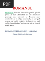 Publicat in 1938, Enigma Otiliei reprezint confirmarea conceptiilor teoretice ale autorului cu privire la polemica din epoca asupra romanului. Considerand ca literatura noastra nu este inca pregatita pt romanul de inspiratie citadina si cu eroi problematici care se dezvolta pe plan european, G. Calinescu sustine c formula epica a romanului realist- obiectiv este singura ce poate sa ilustreze individualitatea poporului nostru cu o civilizatie predominant rural, in care pn si capitala nu este decat un sat mai mare, iar scriitorul este fie taran, fie provincial, cu moravuri simple, cu vorba asezata. Si totusi, chiar daca se inscrie in traditia realismului critic, romanul scris de G. Calinescu reprezinta o creatie cu mult mai complexa si originala, de atmosfera moderna. Cartea depaseste modelul balzacian datorita structurii clasice a scriitorului, ceea ce implic manifestarea unei constiinte critice in interiorul creatiei : Clasic ar fi un creator care observa si se observa in spirit critic (E. Simion). Digresiunile eseistice (despre arhitectura, decoratiuni interioare, muzica, literatura, psihologie, sociologie etc), investigatiile naturaliste (analiza dezechilibrului psihic ereditar din familia Tulea sau procesul degenerarii treptate a lui Mos Costache din cauza lacomiei pt avere), plcerea regiei (N. Manolescu) sau dramatizarea unor episoade (jocul de carti), descriptia romantica a mosiei lui Pascalopol (grandioasa, lirica, bogata in referinte mitologice si in artificii artistice rafinate), personajele reflector (Felix si Stanica Ratiu) etc constituie procedee originale si de modernitate. In aceeasi categorie se inscriu metodele de sondare a psihologiei, pluriperspectivismul (procedeul oglinzilor paralele ), sau jocul estetic de esen baroc, ce presupune nlocuirea canonului clasic printr-unul grotesc (N. Manolescu), ironie, arj (ngroare caricatural, ruptura cu proporiile fireti n prezentarea psihologiilor ), jocul cu mti, parodia (rsturnarea modelelor consacrate ). Sunt toate niste caracteristici care anticipeaza romanul corintic, postmodernist. In aceasta lumina, este cu atat mai greu de precizat cu exactitate tipul de roman pe care il constituie cartea: obiectiv, clasic si realist, de creatie si de analiza, balzacian, doric, modern. Initial G. Calinescu si-a numit romanul Parintii Otiliei, titlu prin care semnala cititorilor tematica balzaciana a paternitatii. Editorul operei a considerat insa ca este mai sonor si mai atragator un titlu ca Enigma Otiliei, pentru c focalizeaz un personaj feminin fascinant si care asigur coeziunea firelor epice. Constient ca titlul e un mijloc comercial, prozatorul accepta propunerea, desi considera ca noua denumire nu reflect neaparat o realitate: Enigma nu e a ei [...] In enigma Otiliei crede Felix Un barbat de 21 de ani [...] nu poate indreptati pe femeia care fuge de el, mai ales pt un om in varsta. El nusi poate explica asta decat printr-o enigma (dintr-o scrisoare a prozatorului). Si totusi Otilia, cu firea sa capricioasa, nestatornica si cuceritoare, specifica adolescentei, reflecta intru totul tipologia propusa de titlu, caci: Enigma ei este insasi feminitatea ei mereu proaspata (Pompiliu Constantinescu). Tematica este realista, sociala, axat pe o problematic balzacian: paternitatea ( care dezvolt un conflict de ordin moral ) ,mostenirea.( implicnd un conflict economic specific burgheziei bucuretene, fr scrupule n rapacitatea sa) i parvenitismul ( toate personajele,cu excepia lui Pascalopol, nzuiesc s ptrund ntr-o sfer social superioar, prin mbogire, cstorie sau afirmare profesional ). Societatea pe care o descrie autorul este una care pune pret de valorile materiale, adica o lume al carei motor il constituie banul, ca si in opera lui Balzac ( Banii sunt [Link] sunt totul.. Mo Goriot). In functie de avere se obtine o pozitie sociala onorabila sau se intemeiaza o familie, ceea ce poate sa explice lcomia clanului Tulea sau lipsa de scrupule a lui Stanica Ratiu. 1