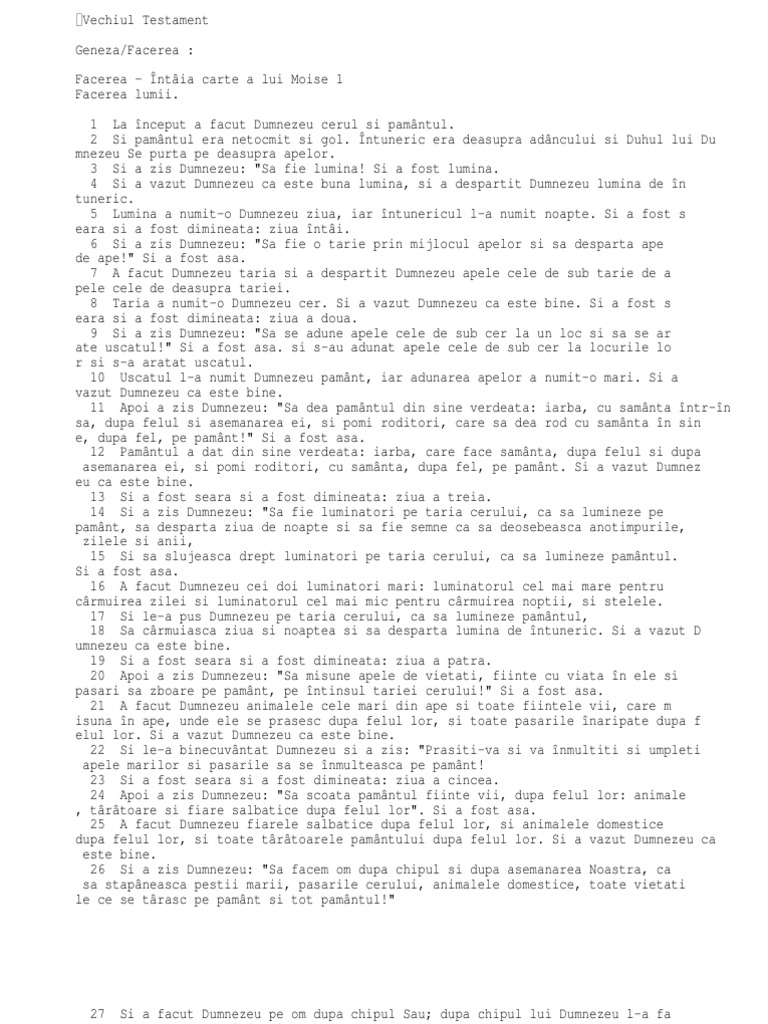 . 2 Si pamntul era netocmit si gol. ntuneric era deasupra adncului si Duhul lui Du mnezeu Se purta pe deasupra apelor. 3 Si a zis Dumnezeu: "Sa fie lumina! Si a fost lumina. 4 Si a vazut Dumnezeu ca este buna lumina, si a despartit Dumnezeu lumina de n tuneric. 5 Lumina a numit-o Dumnezeu ziua, iar ntunericul l-a numit noapte. Si a fost s eara si a fost dimineata: ziua nti. 6 Si a zis Dumnezeu: "Sa fie o tarie prin mijlocul apelor si sa desparta ape de ape!" Si a fost asa. 7 A facut Dumnezeu taria si a despartit Dumnezeu apele cele de sub tarie de a pele cele de deasupra tariei. 8 Taria a numit-o Dumnezeu cer. Si a vazut Dumnezeu ca este bine. Si a fost s eara si a fost dimineata: ziua a doua. 9 Si a zis Dumnezeu: "Sa se adune apele cele de sub cer la un loc si sa se ar ate uscatul!" Si a fost asa. si s-au adunat apele cele de sub cer la locurile lo r si s-a aratat uscatul. 10 Uscatul l-a numit Dumnezeu pamnt, iar adunarea apelor a numit-o mari. Si a vazut Dumnezeu ca este bine. 11 Apoi a zis Dumnezeu: "Sa dea pamntul din sine verdeata: iarba, cu samnta ntr-n sa, dupa felul si asemanarea ei, si pomi roditori, care sa dea rod cu samnta n sin e, dupa fel, pe pamnt!" Si a fost asa. 12 Pamntul a dat din sine verdeata: iarba, care face samnta, dupa felul si dupa asemanarea ei, si pomi roditori, cu samnta, dupa fel, pe pamnt. Si a vazut Dumnez eu ca este bine. 13 Si a fost seara si a fost dimineata: ziua a treia. 14 Si a zis Dumnezeu: "Sa fie luminatori pe taria cerului, ca sa lumineze pe pamnt, sa desparta ziua de noapte si sa fie semne ca sa deosebeasca anotimpurile, zilele si anii, 15 Si sa slujeasca drept luminatori pe taria cerului, ca sa lumineze pamntul. Si a fost asa. 16 A facut Dumnezeu cei doi luminatori mari: luminatorul cel mai mare pentru crmuirea zilei si luminatorul cel mai mic pentru crmuirea noptii, si stelele. 17 Si le-a pus Dumnezeu pe taria cerului, ca sa lumineze pamntul, 18 Sa crmuiasca ziua si noaptea si sa desparta lumina de ntuneric. Si a vazut D umnezeu ca este bine. 19 Si a fost seara si a fost dimineata: ziua a patra. 20 Apoi a zis Dumnezeu: "Sa misune apele de vietati, fiinte cu viata n ele si pasari sa zboare pe pamnt, pe ntinsul tariei cerului!" Si a fost asa. 21 A facut Dumnezeu animalele cele mari din ape si toate fiintele vii, care m isuna n ape, unde ele se prasesc dupa felul lor, si toate pasarile naripate dupa f elul lor. Si a vazut Dumnezeu ca este bine. 22 Si le-a binecuvntat Dumnezeu si a zis: "Prasiti-va si va nmultiti si umpleti apele marilor si pasarile sa se nmulteasca pe pamnt! 23 Si a fost seara si a fost dimineata: ziua a cincea. 24 Apoi a zis Dumnezeu: "Sa scoata pamntul fiinte vii, dupa felul lor: animale , trtoare si fiare salbatice dupa felul lor". Si a fost asa. 25 A facut Dumnezeu fiarele salbatice dupa felul lor, si animalele domestice dupa felul lor, si toate trtoarele pamntului dupa felul lor. Si a vazut Dumnezeu ca este bine. 26 Si a zis Dumnezeu: "Sa facem om dupa chipul si dupa asemanarea Noastra, ca sa stapneasca pestii marii, pasarile cerului, animalele domestice, toate vietati le ce se trasc pe pamnt si tot pamntul!"
