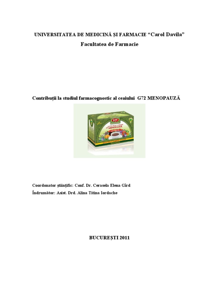 Cap. 1 Date generale privind ceaiul G72 MENOPAUZ............................................3 1.1. Compoziia ceaiului, aciunile, utilizrile i modul de preparare conform producatorului......................................................................................................................3 1.2. Descrierea produselor componente ale ceaiului..........................................................4 1.3. Compoziia chimic a produselor componente ale ceaiului......................................11 1.4. Aciunea farmacologic a materiilor prime vegetale..................................................15 1.5. ntrebuinrile materiilor prime vegetale....................................................................17 1.6. Preparate farmaceutice care conin extracte sau produse vegetale componente ale formulrii farmaceutice......................................................................................................19 Cap. 2 Studiul farmacognostic al ceaiului G72 MENOPAUZ.................................27 2.1. Determinarea identitii..............................................................................................27 2.1.1. Examen macroscopic...............................................................................................27 2.1.2. Examen microscopic ...............................................................................................28 2.1.3. Examen microchimic...............................................................................................30 2.1.4. Analiza chimic calitativ a soluiei extractive apoase............................................30 2.2. Determinarea puritii.................................................................................................39 2.2.1. Determinarea corpurilor strine...............................................................................39 2.2.2. Determinarea impuritilor......................................................................................39 2.3. Determinarea calitii.................................................................................................39 2.3.1. Determinri preliminare..........................................................................................39 2.3.2. Dozarea principiilor active.......................................................................................40 Cap. 3 Corelaii ntre principiile active identificate i aciunea terapeutic a ceaiului G72 MENOPAUZ........................................................................................................42