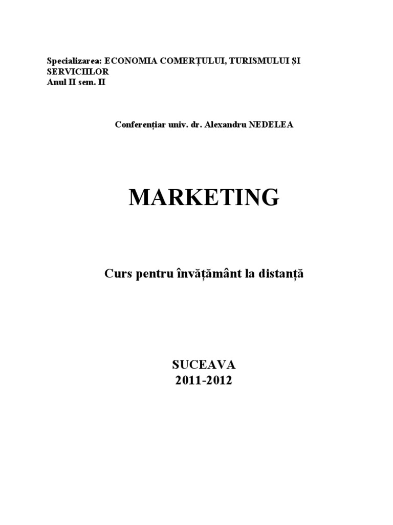 d) noile tehnologii; e) proiecte de viitor; f) contacte cu exteriorul. SOLUII TESTE FINALE 1. 2. 3. 4. 5. 6. 7. 8. a, b, c, d a, c, d c b, d d c a b BIBLIOGRAFIE 1. Balaure, V. (coord.), Marketing, Ed. Uranus, Bucureti, 2002 2. Catedra de Marketing a Facultii de tiine Economice, Univ. Babe-Bolyai, Bazele marketingului, Ed. Presa Universitar Clujean, Cluj-Napoca, 2002 3. Kotler, Ph., Managementul marketingului, Ed. Teora, Bucureti, 2008 4. Kotler, Ph., Principiile marketingului, Ed. Teora, Bucureti, 2003 5. Kotler, Ph., Conform lui Kotler, Brandbuilders, Bucureti, 2006 6. Kotler, Ph., Marketing de la A la Z, CODECS, Bucureti, 2004 7. Manole, V., Stoian, M., Marketing, Ed. ASE, Bucureti, 2002 8. Nedelea, Al., Bazele marketingului, Ed. Sedcom Libris, Iai, 2009 9. Nedelea, Al., Marketing n exerciii: aplicaii, studii de caz, teste , Ed. Didactic i Pedagogic, Bucureti, 2009 10. Nedelea, Al., Marketing, Ed. Didactic i Pedagogic, Bucureti, 2005 11. Nedelea, Al., Politici de marketing, Ed. Didactic i Pedagogic, Bucureti, 2008 12. Niculescu, E. (coord.), Marketing modern, Concepte, tehnici, strategii, Polirom, Iai, 2000 13. Olteanu, V. (coord.), Cercetri de marketing, Ed. Fundaiei Romnia de Mine, Bucureti, 2000 14. Pop, N. Al.(coord.), Marketing strategic, Ed. Economic, Bucureti, 2000 15. Prutianu, t., Anastasiei, B., Jijie, I., Cercetarea de marketing, Polirom, Iai, 2002 Resurse web: [Link] Clubul de marketing [Link] [Link] [Link] [Link] [Link] [Link] [Link] [Link] [Link] TEME PENTRU LUCRRI DE LICEN Avnd n vedere numrul limitat al temelor posibil a fi coordonate de un cadru didactic, se recomand ca nscrierea s se fac n anul II de studii. 1. Analiza mixului de marketing la firma ...