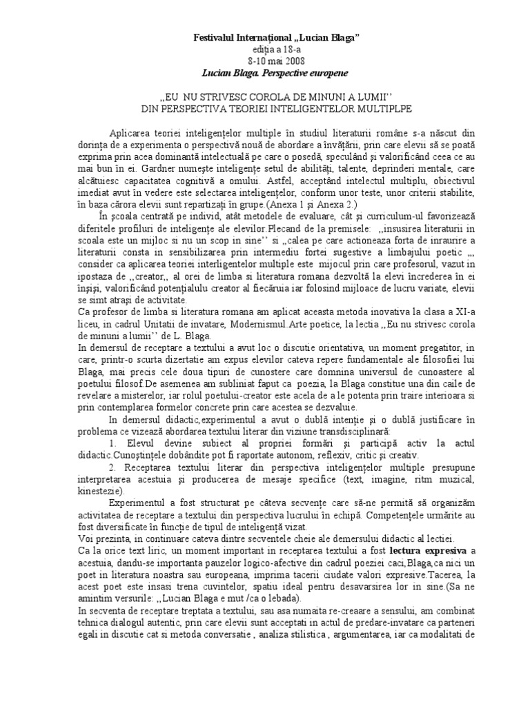 Perspective europene ,,EU NU STRIVESC COROLA DE MINUNI A LUMII DIN PERSPECTIVA TEORIEI INTELIGENTELOR MULTIPLPE Aplicarea teoriei inteligenelor multiple n studiul literaturii romne s-a nscut din dorina de a experimenta o perspectiv nou de abordare a nvrii, prin care elevii s se poat exprima prin acea dominant intelectual pe care o posed, speculnd i valorificnd ceea ce au mai bun n ei. Gardner numete inteligene setul de abiliti, talente, deprinderi mentale, care alctuiesc capacitatea cognitiv a omului. Astfel, acceptnd intelectul multiplu, obiectivul imediat avut n vedere este selectarea inteligenelor, conform unor teste, unor criterii stabilite, n baza crora elevii sunt repartizai n grupe.(Anexa 1 i Anexa 2.) n coala centrat pe individ, att metodele de evaluare, ct i curriculum-ul favorizeaz diferitele profiluri de inteligene ale [Link] de la premisele: ,,insusirea literaturii in scoala este un mijloc si nu un scop in sine si calea pe care actioneaza forta de inraurire a literaturii consta in sensibilizarea prin intermediu fortei sugestive a limbajului poetic , consider ca aplicarea teoriei interligentelor multiple este mijocul prin care profesorul, vazut in ipostaza de ,,creator,, al orei de limba si literatura romana dezvolt la elevi ncrederea n ei nii, valorificnd potenialulu creator al fiecruia iar folosind mijloace de lucru variate, elevii se simt atrai de activitate. Ca profesor de limba si literatura romana am aplicat aceasta metoda inovativa la clasa a XI-a liceu, in cadrul Unitatii de invatare, [Link] poetice, la lectia ,,Eu nu strivesc corola de minuni a lumii de L. Blaga. In demersul de receptare a textului a avut loc o discutie orientativa, un moment pregatitor, in care, printr-o scurta dizertatie am expus elevilor cateva repere fundamentale ale filosofiei lui Blaga, mai precis cele doua tipuri de cunostere care domnina universul de cunoastere al poetului [Link] asemenea am subliniat faput ca poezia, la Blaga constitue una din caile de revelare a misterelor, iar rolul poetului-creator este acela de a le potenta prin traire interioara si prin contemplarea formelor concrete prin care acestea se dezvaluie. In demersul didactic,experimentul a avut o dubl intenie i o dubl justificare n problema ce vizeaz abordarea textului literar din viziune transdisciplinar: 1. Elevul devine subiect al propriei formri i particip activ la actul [Link] dobndite pot fi raportate autonom, reflexiv, critic i creativ. 2. Receptarea textului literar din perspectiva inteligenelor multiple presupune interpretarea acestuia i producerea de mesaje specifice (text, imagine, ritm muzical, kinestezie). Experimentul a fost structurat pe cteva secvene care s-ne permit s organizm activitatea de receptare a textului din perspectiva lucrului n echip. Competenele urmrite au fost diversificate n funcie de tipul de inteligen vizat. Voi prezinta, in continuare cateva dintre secventele cheie ale demersului didactic al lectiei. Ca la orice text liric, un moment important in receptarea textului a fost lectura expresiva a acestuia, dandu-se importanta pauzelor logico-afective din cadrul poeziei caci,Blaga,ca nici un poet in literatura noastra sau europeana, imprima tacerii ciudate valori [Link], la acest poet este insasi trena cuvintelor, spatiu ideal pentru desavarsirea lor in sine.(Sa ne amintim versurile: ,,Lucian Blaga e mut /ca o lebada). In secventa de receptare treptata a textului, sau asa numaita re-creaare a sensului, am combinat tehnica dialogul autentic, prin care elevii sunt acceptati in actul de predare-invatare ca parteneri egali in discutie cat si metoda conversatie , analiza stilistica , argumentarea, iar ca modalitati de
