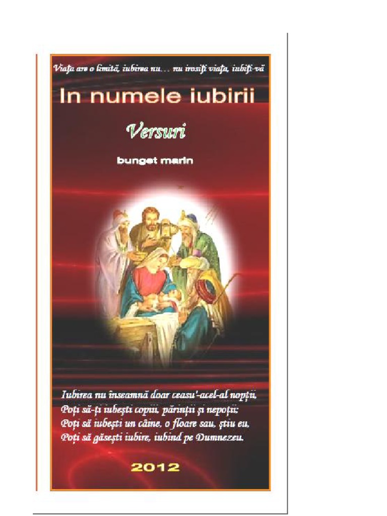 In numele iubirii Autobiografie. Eu m-am nscut aici, ntre cuvinte. Nu cutai iubirea prea departe Iubete-m doar ct s nu m doar. Acolo unde visele nu dorm. M iart tu, copile. Iubirea e suflet n doi. Am s te scriu n versul de iubire. S nu uitati de mine. Vorbim despre iubire. S nu jurai iubire. E-att de simplu, Doamne, s iubeti Te caut. De cte ori cuvintele n-ajung, Tu, ingerul iubirii. S lai pmntului o floare. Te voi gsi pe drumuri din poeme. Mai pun un vis. Celestic. i las iubirii dreptul s m doar. Am plns aceeai lacrim amndoi. Gnduri. La tine mam. Nscut din cuvinte. Am adunat din visul tu o floare. Mi-a mai rmas un singur anotimp. Cum s iubesc? Primete-mi dor i druie-mi iubire. Din dor de noi. i-am ascultat tcerile din oapte Mai am o lacrim de plns. Ascult culori de trandafir n floare. Acolo unde timpul ngroap amintiri. Rtcire. S nu lsm. A vrea s fiu nebunul ce seamn iubire. 2 4 5 6 7 8 9 10 11 12 13 14 15 16 17 18 19 20 21 22 23 24 25 26 28 29 30 31 32 33 34 35 36 37 38 40
