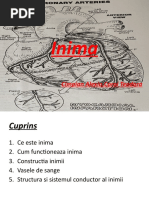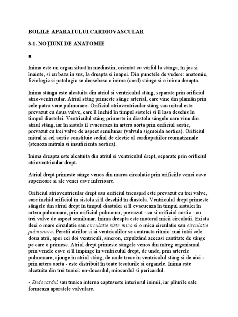 NOIUNI DE ANATOMIE Inima este un organ situat n mediastin, orientat cu vrful la stnga, n jos si nainte, si cu baza n sus, la dreapta si napoi. Din punctele de vedere: anatomic, fiziologic si patologic se deosebesc o inima (cord) stnga si o inima dreapta. Inima stnga este alcatuita din atriul si ventriculul stng, separate prin orificiul atrio-ventricular. Atriul stng primeste snge arterial, care vine din plamn prin cele patru vene pulmonare. Orificiul atrioventricular stng sau mitral este prevazut cu doua valve, care l nchid n timpul sistolei si l lasa deschis n timpul diastolei. Ventriculul stng primeste n diastola sngele care vine din atriul stng, iar n sistola l evacueaza n artera aorta prin orificiul aortic, prevazut cu trei valve de aspect semilunar (valvula sigmoida aortica). Orificiul mitral si cel aortic constituie sediul de electie al cardiopatiilor reumatismale (stenoza mitrala si insuficienta aortica). Inima dreapta este alcatuita din atriul si ventriculul drept, separate prin orificiul atrioventricular drept. Atriul drept primeste snge venos din marea circulatie prin orificiile venei cave superioare si ale venei cave inferioare. Orificiul atrioventricular drept sau orificiul tricuspid este prevazut cu trei valve, care nchid orificiul n sistola si l deschid n diastola. Ventriculul drept primeste sngele din atriul drept n timpul diastolei si l evacueaza n timpul sistolei n artera pulmonara, prin orificiul pulmonar, prevazut - ca si orificiul aortic - cu trei valve de aspect semilunar. Inima dreapta este motorul micii circulatii. Exista deci o mare circulatie sau circulatie siste-mica si o mica circulatie sau circulatie pulmonara. Peretii atriilor si ai ventriculilor se contracta ritmic: mai nti cele doua atrii, apoi cei doi ventriculi, sincron, expulznd aceeasi cantitate de snge pe care o primesc. Atriul drept primeste sngele venos din ntreg organismul prin venele cave si l mpinge n ventriculul drept, de unde, prin arterele pulmonare, ajunge n atriul stng, de unde trece n ventriculul stng si de aici prin artera aorta - este distribuit n toate tesuturile si organele. Inima este alcatuita din trei tunici: en-docardul, miocardul si pericardul. - Endocardul sau tunica interna captuseste interiorul inimii, iar pliurile sale formeaza aparatele valvulare.