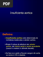 Evolutie: formele usoare sunt asimptomatice; cele severe evolueaza catre hipertensiune pulmonara si insuficienta cardiaca. Tulburarile de ritm sunt mai putin frecvente, iar complicatiile tromboembolice, mai rare dect n stenoza mitrala. 3.7.3. INSUFICIENA AORTIC Definitie: prin insuficienta aortica se ntelege nchiderea incompleta a valvulelor aor-tice n timpul diastolei, cu refularea sngelui n diastola din aorta n ventriculul stng. Prin efortul suplimentar pe care-1 impune ventricolului stng, refluxul de snge, duce la dilatarea si hipertrofia acestuia. Cu timpul boala evolueaza, aparnd la nceput o insuficienta ventriculara stnga cu staza pulmonara si apoi o insuficienta cardiaca dreapta, prin cedarea ventriculului drept. Etiopatogenie: endocardita reumatica este cauza cea mai frecventa, n special la tineri. Mai rar, boala este datorita aterosclerozei, sifilisului sau unui traumatism cardiac. Leziunea pura este mai rara, de obicei fiind nsotita de stenoza aortica sau mitrala. Simptome: boala este mult timp bine tolerata, bolnavul fiind asimptomatic sau, mai rar, resimtind bataile inimii si ale arterelor la nivelul gtului, precordial sau la extremitati. Cu timpul (mai trziu dect n stenoza mitrala), apar dispneea de efort sau paroxistica, ameteli ocazionale si semne de insuficienta cardiaca, la nceput stnga, ulterior dreapta. Bolnavul este palid, uneori animat de miscari ritmice ale capului. Vrful inimii este glo-bulos, loveste cu putere peretele toracic, este cobort si deplasat n afara. Suflul diastolic, fin, dulce, aspirativ, descrescendo, aparut imediat dupa zgomotul //, localizat parasternal stng n spatiile al III-lea - al IV-lea sau la focarul aortei, este caracteristic. Semnele periferice, datorite caderii bruste a tensiunii diastolice si cresterii tensiunii sistolice, sunt foarte caracteristice: pulsatii arteriale evidente la inspectie ("dans" arterial), alternante de roseata si paloare la nivelul tegumentelor si mai ales al unghiilor usor comprimate (puls arterial sau capilar), puls radial amplu si saltaret la palpare (puls Corrigan), tensiune arteriala cu maxima normala sau crescuta si minima coborta, uneori pna la zero.