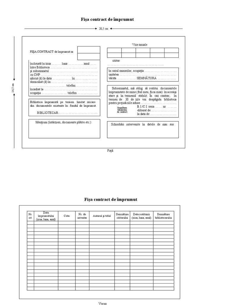 cititor n cazul minorilor, ocupaia . unitatea vrsta SEMNTURA Subsemnatul, m oblig s restitui documentele mprumutate de mine (fiul meu, fiica mea) n aceeai stare i n termenul stabilit. n caz contrar, n termen de 30 de zile voi despgubi biblioteca pentru prejudiciile aduse . B.I./C.I. seria . nr. Semntura titularului eliberat de de contract la data de . Schimbri intervenite n datele de mai sus