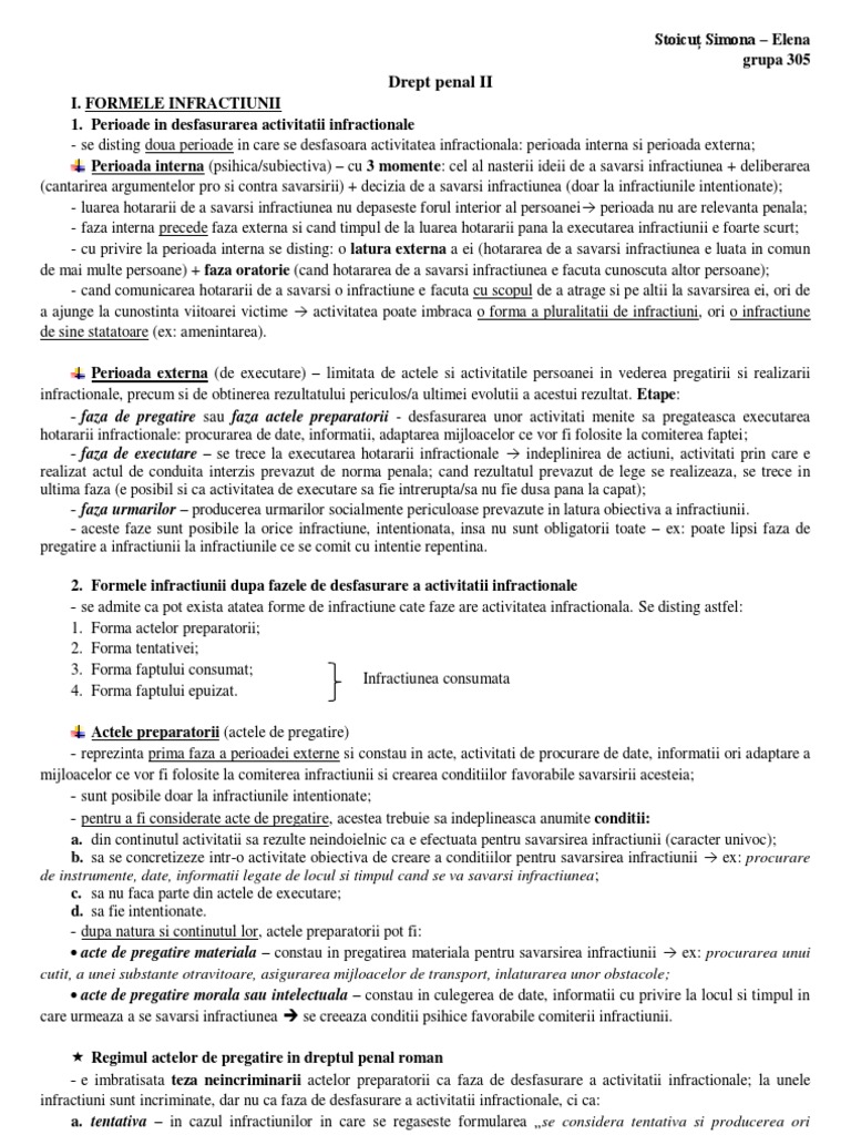 I. FORMELE INFRACTIUNII 1. Perioade in desfasurarea activitatii infractionale - se disting doua perioade in care se desfasoara activitatea infractionala: perioada interna si perioada externa; Perioada interna (psihica/subiectiva) cu 3 momente: cel al nasterii ideii de a savarsi infractiunea + deliberarea (cantarirea argumentelor pro si contra savarsirii) + decizia de a savarsi infractiunea (doar la infractiunile intentionate); - luarea hotararii de a savarsi infractiunea nu depaseste forul interior al persoanei perioada nu are relevanta penala; - faza interna precede faza externa si cand timpul de la luarea hotararii pana la executarea infractiunii e foarte scurt; - cu privire la perioada interna se disting: o latura externa a ei (hotararea de a savarsi infractiunea e luata in comun de mai multe persoane) + faza oratorie (cand hotararea de a savarsi infractiunea e facuta cunoscuta altor persoane); - cand comunicarea hotararii de a savarsi o infractiune e facuta cu scopul de a atrage si pe altii la savarsirea ei, ori de a ajunge la cunostinta viitoarei victime activitatea poate imbraca o forma a pluralitatii de infractiuni, ori o infractiune de sine statatoare (ex: amenintarea). Perioada externa (de executare) limitata de actele si activitatile persoanei in vederea pregatirii si realizarii infractionale, precum si de obtinerea rezultatului periculos/a ultimei evolutii a acestui rezultat. Etape: - faza de pregatire sau faza actele preparatorii - desfasurarea unor activitati menite sa pregateasca executarea hotararii infractionale: procurarea de date, informatii, adaptarea mijloacelor ce vor fi folosite la comiterea faptei; - faza de executare se trece la executarea hotararii infractionale indeplinirea de actiuni, activitati prin care e realizat actul de conduita interzis prevazut de norma penala; cand rezultatul prevazut de lege se realizeaza, se trece in ultima faza (e posibil si ca activitatea de executare sa fie intrerupta/sa nu fie dusa pana la capat); - faza urmarilor producerea urmarilor socialmente periculoase prevazute in latura obiectiva a infractiunii. - aceste faze sunt posibile la orice infractiune, intentionata, insa nu sunt obligatorii toate ex: poate lipsi faza de pregatire a infractiunii la infractiunile ce se comit cu intentie repentina. 2. Formele infractiunii dupa fazele de desfasurare a activitatii infractionale - se admite ca pot exista atatea forme de infractiune cate faze are activitatea infractionala. Se disting astfel: 1. Forma actelor preparatorii; 2. Forma tentativei; 3. Forma faptului consumat; Infractiunea consumata 4. Forma faptului epuizat. Actele preparatorii (actele de pregatire) - reprezinta prima faza a perioadei externe si constau in acte, activitati de procurare de date, informatii ori adaptare a mijloacelor ce vor fi folosite la comiterea infractiunii si crearea conditiilor favorabile savarsirii acesteia; - sunt posibile doar la infractiunile intentionate; - pentru a fi considerate acte de pregatire, acestea trebuie sa indeplineasca anumite conditii: a. din continutul activitatii sa rezulte neindoielnic ca e efectuata pentru savarsirea infractiunii (caracter univoc); b. sa se concretizeze intr-o activitate obiectiva de creare a conditiilor pentru savarsirea infractiunii ex: procurare de instrumente, date, informatii legate de locul si timpul cand se va savarsi infractiunea ; c. sa nu faca parte din actele de executare; d. sa fie intentionate. - dupa natura si continutul lor, actele preparatorii pot fi: acte de pregatire materiala constau in pregatirea materiala pentru savarsirea infractiunii ex: procurarea unui cutit, a unei substante otravitoare, asigurarea mijloacelor de transport, inlaturarea unor obstacole; acte de pregatire morala sau intelectuala constau in culegerea de date, informatii cu privire la locul si timpul in care urmeaza a se savarsi infractiunea se creeaza conditii psihice favorabile comiterii infractiunii. Regimul actelor de pregatire in dreptul penal roman - e imbratisata teza neincriminarii actelor preparatorii ca faza de desfasurare a activitatii infractionale; la unele infractiuni sunt incriminate, dar nu ca faza de desfasurare a activitatii infractionale, ci ca: a. tentativa in cazul infractiunilor in care se regaseste formularea se considera tentativa si producerea ori procurarea instrumentelor...; ex: art 173 alin 2 privind sanctionarea tentativei, la infractiunile contra sigurantei statului sau art 189 alin ultim privind lipsirea de libertate in mod ilegal;