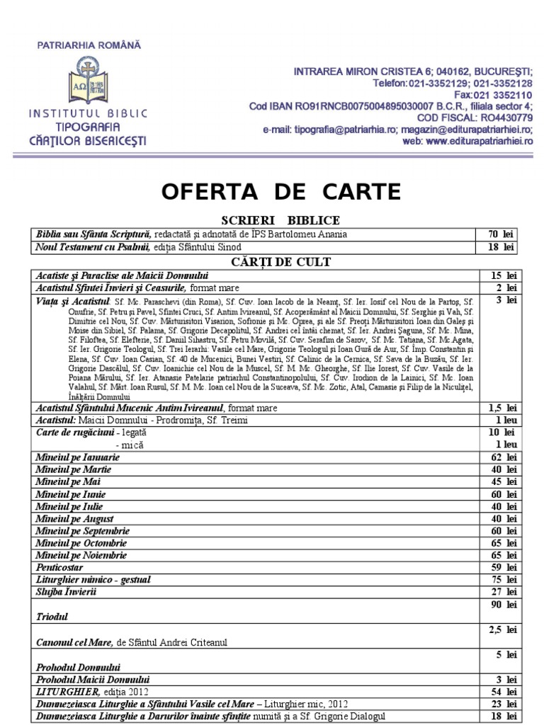 Toate titlurile ofertei mai pot fi gsite i n LIBRRIA CRILOR BISERICETI, aflat n Intrarea Miron Cristea nr. 6, cu acces din Str. 11 Iunie. Toate preurile din ofert sunt valabile doar la Depozitul Tipografiei, cu condiia ca valoarea comenzii s fie de minim 500 RON sau minim 10 exemplare/titlu. Ateptm comenzile dumneavoastr la numerele de telefon: Tel: 021/3352128; 021/3352129; 021/3352111 - int. 308 sau 333; Fax: 021 / 3351900;