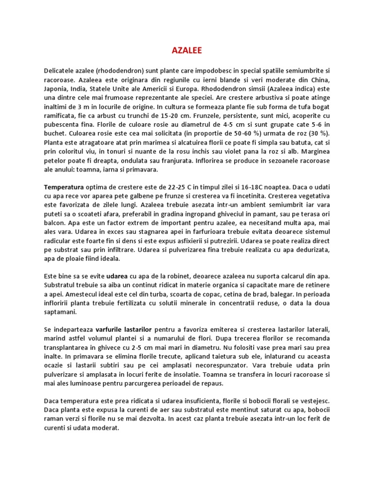 japonez (Rhododendron obtusum). Ambele sunt tufe pitice care cresc cam 30 -45 cm nlime. Nenumrate azalee indiene se cumpr n fiecare an la Crciun, pentru decoraiuni pe perioada srbtorilor i a Anului Nou. Cnd cumprai o plant, alegei una cu puine flori deschise i cu muli muguri. Fr o ingrijire corect, florile se ofilesc, iar frunzele cad intr-o sptmn sau dou. Secretul meninerii unei plante n floare timp de mai multe sptmni i a capacitii sale de a nflori din nou n anul urmtor, este s meninei compostul bine udat (nu numai umed), la rcoare i la lumin puternic. Gama de varieti a azaleei indiene sau simplu azalee Rhododendron simsii este enorm. Culoarea cea mai rspndit este roz, dar sunt i albe, roii i purpurii. Exist bicolore atractive, ca Inga, roz cu margini albe i Osta, aib cu centrul roz. Se gsesc varieti simple i duble, sau cu petale ncreite. Ultimele nouti sunt azaleele trtoare i n form de piramid. Florile azaleei japoneze sunt mai mici dect ale azaleei indiene, dar aceast plant are avantajul de a se simii bine ca tuf de grdin, dac se sdete afar, dup ce perioada de nflorire s-a ncheiat. Ingrijire: Temperatur: inei planta la rcoare - 10-16'C este ideal. Lumin: Loc puternic luminat, dar nu n btaia soarelui. Ap: Meninei compostul ud n permanen, folosind ap moale. Umiditatea aerului: Pulverizai frunzele zilnic n perioada de nflorire.