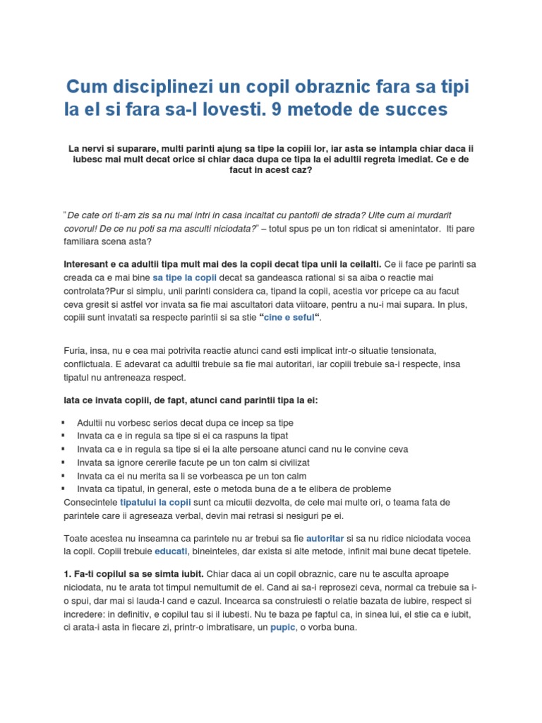 Adultii nu vorbesc serios decat dupa ce incep sa tipe Invata ca e in regula sa tipe si ei ca raspuns la tipat Invata ca e in regula sa tipe si ei la alte persoane atunci cand nu le convine ceva Invata sa ignore cererile facute pe un ton calm si civilizat Invata ca ei nu merita sa li se vorbeasca pe un ton calm Invata ca tipatul, in general, este o metoda buna de a te elibera de probleme Consecintele tipatului la copii sunt ca micutii dezvolta, de cele mai multe ori, o teama fata de parintele care ii agreseaza verbal, devin mai retrasi si nesiguri pe ei. Toate acestea nu inseamna ca parintele nu ar trebui sa fie autoritar si sa nu ridice niciodata vocea la copil. Copiii trebuie educati, bineinteles, dar exista si alte metode, infinit mai bune decat tipetele. 1. Fa-ti copilul sa se simta iubit. Chiar daca ai un copil obraznic, care nu te asculta aproape niciodata, nu te arata tot timpul nemultumit de el. Cand ai sa-i reprosezi ceva, normal ca trebuie sa io spui, dar mai si lauda-l cand e cazul. Incearca sa construiesti o relatie bazata de iubire, respect si incredere: in definitiv, e copilul tau si il iubesti. Nu te baza pe faptul ca, in sinea lui, el stie ca e iubit, ci arata-i asta in fiecare zi, printr-o imbratisare, un pupic, o vorba buna.