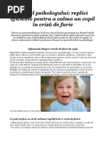 Mihaela, 13 ani, tocmai a aflat ca nu poate pleca acasa la prietena ei. Intai iti faci ordine in camera ta, asa cum bine stii ca trebuie si cum ai promis, tii minte? ii spune mama ei. Mihaela se apropie de fata mamei ei si urla: Esti cea mai rea mama din lume! Te urasc!! si ii intoarce spatele fugind in camera ei si trantind usa. Gata! Pana aici! Esti pedepsita, domnisoara! striga mama ei la ea. Ramane epuizata, infranta si nesigura daca a procedat corect sau nu. Regula: nu iti provoca copilul cand este furios este ca si cum arunci gaz pe foc. Daca esti parinte, sunt ceva posibilitati sa te fi confruntat si tu cu asemenea situatii, chiar si daca ai un copil de varsta mai mica. De ce oare de cele mai multe ori ajungem sa avem meciuri de tipete cu copiii nostri sau, mai rau, sa nu stim cum sa procedam mai bine, atunci cand apare o izbucnire nervoasa si furioasa a copilului? Felul in care gestionezi acele cateva minute cand izbucneste un conflict intre tine si copilul tau sunt decisive nu doar pentru ce va urma, dar si pentru educarea lui si pentru relatia voastra. Afla de la specialistii [Link] care sunt cele 10 reguli cu ajutorul carora te poti descurca sa stapanesti copilul furios (si, evident, irational in timp ce este furios) chiar in acele clipe de criza.