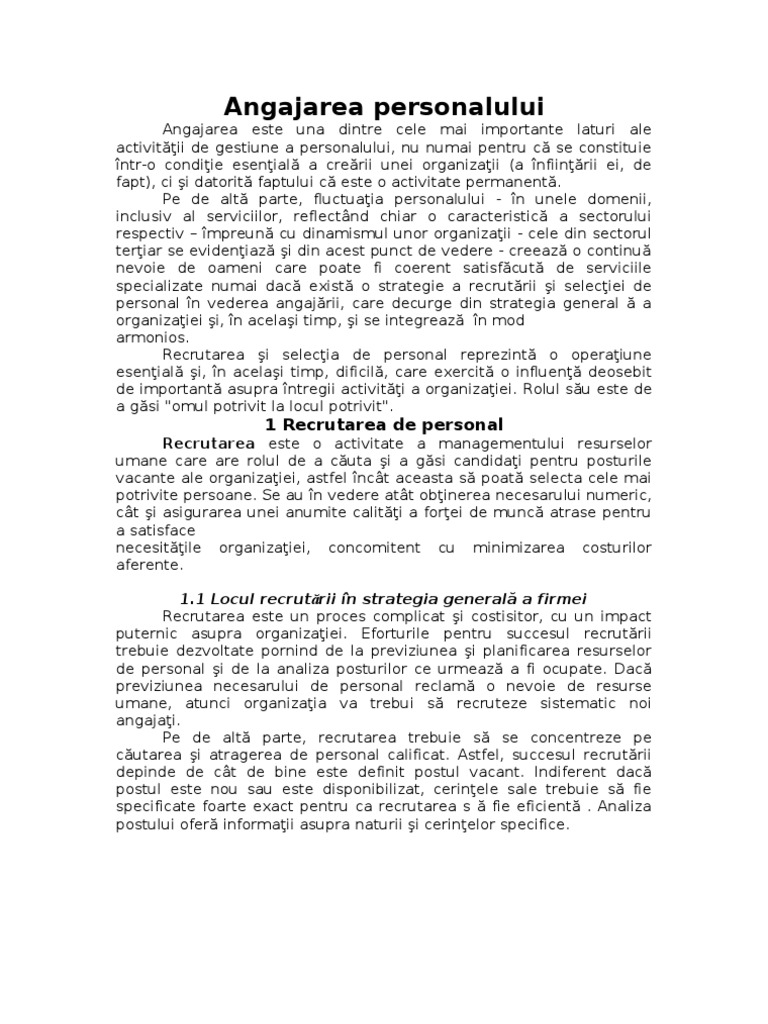 ntr-o condiie esenial a crerii unei organizaii (a nfiinrii ei, de fapt), ci i datorit faptului c este o activitate permanent. Pe de alt parte, fluctuaia personalului - n unele domenii, inclusiv al serviciilor, reflectnd chiar o caracteristic a sectorului respectiv mpreun cu dinamismul unor organizaii - cele din sectorul teriar se evideniaz i din acest punct de vedere - creeaz o continu nevoie de oameni care poate fi coerent satisfcut de serviciile specializate numai dac exist o strategie a recrutrii i seleciei de personal n vederea angajrii, care decurge din strategia general a organizaiei i, n acelai timp, i se integreaz n mod armonios. Recrutarea i selecia de personal reprezint o operaiune esenial i, n acelai timp, dificil, care exercit o influen deosebit de important asupra ntregii activiti a organizaiei. Rolul su este de a gsi "omul potrivit la locul potrivit".