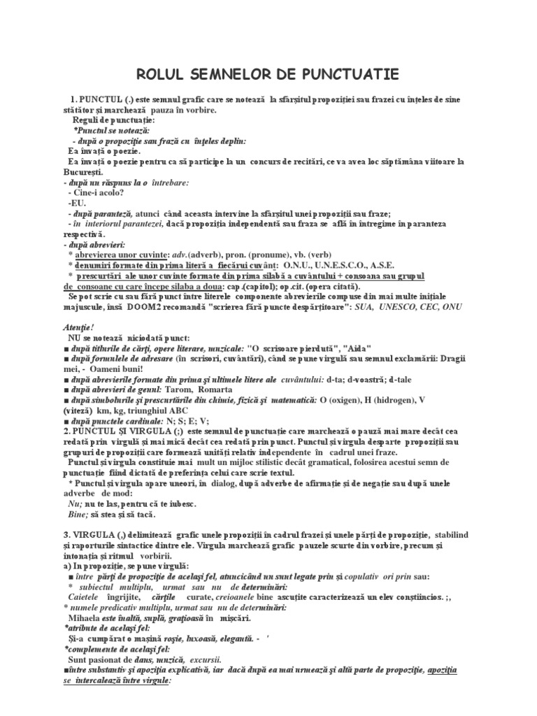 1. PUNCTUL (.) este semnul grafic care se noteaz la sfritul propoziiei sau frazei cu neles de sine stttor i marcheaz pauza n vorbire. Reguli de punctuaie: *Punctul se noteaz: - dup o propoziie sau fraz cu neles deplin: Ea nva o poezie. Ea nva o poezie pentru ca s participe la un concurs de recitri, ce va avea loc sptmna viitoare la Bucureti. - dup un rspuns la o ntrebare: - Cine-i acolo? -EU. - dup parantez, atunci cnd aceasta intervine la sfritul unei propoziii sau fraze; - n interiorul parantezei, dac propoziia independent sau fraza se afl n ntregime n paranteza respectiv. - dup abrevieri: * abrevierea unor cuvinte: adv.(adverb), pron. (pronume), vb. (verb) * denumiri formate din prima liter a fiecrui cuvnt: O.N.U., U.N.E.S.C.O., A.S.E. * prescurtri ale unor cuvinte formate din prima silab a cuvntului + consoana sau grupul de consoane cu care ncepe silaba a doua: cap.(capitol); [Link]. (opera citat). Se pot scrie cu sau fr punct ntre literele componente abrevierile compuse din mai multe iniiale majuscule, ns DOOM2 recomand "scrierea fr puncte despritoare": SUA, UNESCO, CEC, ONU Atenie! NU se noteaz niciodat punct: dup titlurile de cri, opere literare, muzicale: "O scrisoare pierdut", "Aida" dup formulele de adresare (n scrisori, cuvntri), cnd se pune virgul sau semnul exclamrii: Dragii mei, - Oameni buni! dup abrevierile formate din prima i ultimele litere ale cuvntului: d-ta; d-voastr; d-tale dup abrevieri de genul: Tarom, Romarta dup simbolurile i prescurtrile din chimie, fizic i matematic: O (oxigen), H (hidrogen), V (vitez) km, kg, triunghiul ABC dup punctele cardinale: N; S; E; V; 2. PUNCTUL I VIRGULA (;) este semnul de punctuaie care marcheaz o pauz mai mare dect cea redat prin virgul i mai mic dect cea redat prin punct. Punctul i virgula desparte propoziii sau grupuri de propoziii care formeaz uniti relativ independente n cadrul unei fraze. Punctul i virgula constituie mai mult un mijloc stilistic dect gramatical, folosirea acestui semn de punctuaie fiind dictat de preferina celui care scrie textul. * Punctul i virgula apare uneori, n dialog, dup adverbe de afirmaie i de negaie sau dup unele adverbe de mod: Nu; nu te las, pentru c te iubesc. Bine; s stea i s tac. 3. VIRGULA (,) delimiteaz grafic unele propoziii n cadrul frazei i unele pri de propoziie, stabilind i raporturile sintactice dintre ele. Virgula marcheaz grafic pauzele scurte din vorbire, precum i intonaia i ritmul vorbirii. a) In propoziie, se pune virgul: ntre pri de propoziie de acelai fel, atuncicnd nu sunt legate prin i copulativ ori prin sau: * subiectul multiplu, urmat sau nu de determinri: Caietele ngrijite, crile curate, creioanele bine ascuite caracterizeaz un elev contiincios. ;, * numele predicativ multiplu, urmat sau nu de determinri: Mihaela este nalt, supl, graioas n micri. *atribute de acelai fel: i-a cumprat o main roie, luxoas, elegant. - ' *complemente de acelai fel: Sunt pasionat de dans, muzic, excursii. ntre substantiv i apoziia explicativ, iar dac dup ea mai urmeaz i alt parte de propoziie, apoziia se intercaleaz ntre virgule: