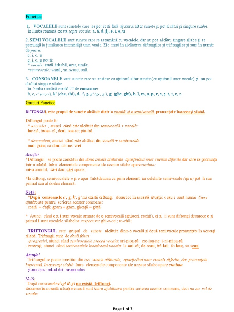 1. VOCALELE sunt sunetele care se pot rosti far ajutorul altor sunete i pot alctui i singure silabe. n limba romn exist apte vocale: a, , (), e, i, o, u 2. SEMI VOCALELE sunt sunete care se aseamn cu vocalele, dar nu pot alctui singure silabe i se pronun la jumtatea intensitii unei voale. Ele intr n alctuirea diftongilor i triftongilor i sunt n numr de patru: e, i, o, u e. i. o. u pot fi: * vocale: erat, iritabil, orar, umr; *semivocale: sear, iar, soare, ou. 3. CONSOANELE sunt sunete care se rostesc cu ajutorul altor sunete (cu ajutorul unor vocale) i nu pot alctui singure silabe. n limba romn exist 22 de consoane: b, c, c' (ce,ci), k' (che, chi), d, f, g, g' (ge, gi), g' (ghe, ghi), h, l, m, n, p, r, s, , t, , v, z. Grupuri Fonetice DIFTONGUL este grupul de sunete alctuit dintr-o vocal i o semivocal. pronunate naceeai silab. Diftongul poate fi: * ascendet , atunci cnd este alctuit din semivocal + vocal: iar-n; broas-c; deal; soa-re; pia-tr. * descendent, atunci cnd este alctuit din vocal + semivocal: mai; gru; ca-dou: ci-ne; vrei Atenie! *Diftongul se poate constitui din dou sunete alturate aparinnd unor cuvinte diferite,dar care se pronun ntr-o silab. Intre elementele componente ale acestor silabe aparecratima: mi-a amintit; s-i dau; c-i spune; *n diftong, semivocalele o i e apar ntotdeauna ca prim element, iar celelalte semivocale (ii u) pot fi sau primul sau al doilea element. Not: *Dup consoanele c', g, k', g' nu exist diftongi deoarece n aceast situaie e sau i sunt numai litere ajuttoare pentru scrierea acestor consoane: cea = c'a; geam = g'am; ghea = g'a. * Atunci cnd c i i sunt vocale urmate de o semivocal (ghiocei, rochii), ei i ii sunt diftongi deoarece e i primul i sunt vocalele silabelor respective: ghi-o-cei; ro-chii; TRIFTONGUL este grupul de sunete alctuit dintr-o vocal i dou semivocale pronunate n aceeai silab. Triftongii sunt de dou feluri: -progresivi, atunci cnd semivocalele preced vocala: ari-pioa-r: cre-ioa-ne: i-ni-mioa-r - centrai, atunci cnd semivocalele ncadreaz vocala: le-oai-c; do-reau; tr-iai; fo-iau;, so-seau Atenie! Triftongul se poate constitui din trei sunete alturate, aparinnd unor cuvinte diferite, dar pronunate mpreun, n aceeai silab. Intre elementele componente ale acestor silabe apare cratima. i-au spus; mi-ai dat; ne-au adus Not: Dup consoanele c\ g\ k\ g\ nu exist triftongi. deoarece n aceast situaie e sau i sunt litere ajuttoare pentru scrierea acestor consoane, deci nu au rol de vocale: