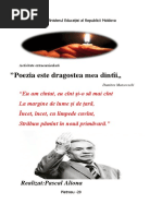 Pr1 Scena li se oferHaiducilor din satul nostru,e vorba de Ansamblul de brbai ,care ne-au obinuit cu melodiile lor de suflet. - Basarabie -Cnd A fost s moar tefan -Serenad(urc ansamblul de femei). Pr2 Ne-am convins c :Limba ni-I frumoas, Drag,bieel, Cci n limba asta a vorbit i El. Pr1 Astzi ,nu vom fi iertai dac nu vom pomeni numele unui rapsod al neamului,care astzi ne adun lng icoana ocrotitoare-LIMBA ROMN,e vorba de [Link], care cu versul lui pictat n aur a nsufleit limba noastr cea [Link] ,imaginar plecm n vizit la Mateevici. Pr2 Poezia n ospeie la Mateevici,recitat de Leonte Zina Pr1 Cntecul Copilrie .Cnt Plop Mihai. Poezia Limba Decencu Alina --------------------------------------
