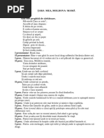 mndria satului, ansamblul de femei ntro nou formul -dar la nceput de drum i elevi i foti elevi ai Gimnaziului din sat i surpriza acestei zile mari-picii de la Grdini. Ambii: V urm o dispoziie bun n continuare! Pr1 Pentru a distinge atmosfera de nceput este invitat Gabriela cu melodia Moldova. n scen apar trei fetie care vor recita trei fragmente de poezie: UN tezaur ca de zestrel am -------------------------------Din darul strmoilor buni i-l poart n suflet un neam , E graiul cu doine- minuni. Din cumpene adus pn la noi, n cronici nscris i cercat La nuni i la plug,n rzboi Pstrat ,fir cu fir adunat. [Link] Mrgritare s-au strns Portas Valentina -------------------Din bucurii i din dor, Din rug ,din chiot ,din plns. Din focul necrutor. Din ur,din sfinte iubiri, Din ochi sgetnd peste veac, Din zise cu vechi potriviri i rare ca iarba de leac. V:Levichi Panfil Dumitria Att mi-e de-ajuns pentru trai: ---------------------------------------O ar ,o cas, un grai, Dar nu orice ar frumoas, Ci ara n care-s acas. O cas n care s-mi vn Din linitea rii lumin, Un grai din nscare ales, n ar i-n cas-neles. Toate: O ar,o cas ,un graiAtt mi-e de-ajuns pentru trai V:Romanciuc
