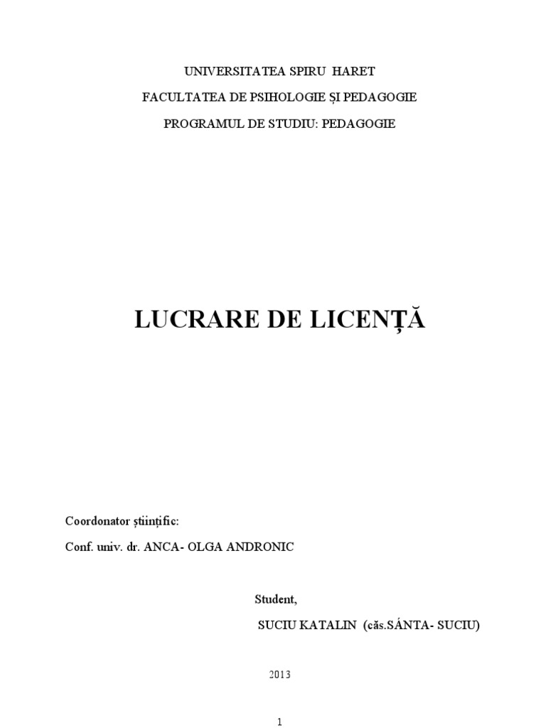 [Link] de creativitate. Din cele mai vechi timpuri omul a simit nevoia de comunicare i d etransmitere celorlali gnduri, planuri, ntmplri. Creativitatea este un proces mental i social care implic generarea unor idei sau concepte noi. Se poate manifestat n multiple domenii. Odat definite, descoperit, recunoscut, creativitatea are nevoie i de instrumente de stimulare. Acestea nu sunt altceva dect metode aplicate n plin proces creativ, avnd ca rezultat creaii mai interesante. Cercetrile au artat c trei factori pot determina creativitatea individual n orice situaie: expertiza cunotinele tehnice, procedural i intelectuale ale unei persoane. competenele de gndire creative modul imaginativ, inventiv i flexibil n care persoana abordeaz problemele. Gndirea creativ se caracterizeaz prin abilitatea puternic de a genera idei noi. motivaia auto-motivaia i obiectul creaiei, altfel spus persoanele creative sunt la discreia propriilor valori i motivaii. Termenul de creativitate a fost introdus n psihologie de [Link], pentru a desemna o formaiune de personalitate5. Conceptul de creativitate este definit n mod diferit de fiecare pedagog care a realizat o definie a creativitii. Termenul creativitate i are originea n cuvntul latin creare = a zmisli, a crea, a furi, a nate. Introdus n vocabularul psihologic n 1937 de Gordon Allport, nlocuiete termenii de: spirit inovator, inventivitate, talent. Creativitatea a fost definit ca: Creativitatea este un fenomen foarte complex, cu multiple aspecte, faete, laturi sau dimensiuni; Creativitatea este un fenomen foarte complex, cu multiple aspecte, faete, laturi sau dimensiuni; Creativitatea este o aptitudine complex, distinct de inteligen i de funcionarea cognitiv i existent n funcie de fluiditatea ideilor, de raionamentul inductiv, de anumite caliti perceptive i de personalitate.. Indivizii creativi dau dovad de imagintie, de spirit inventiv i de originalitateProcesul creativ este favorizat de o