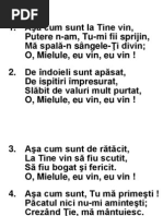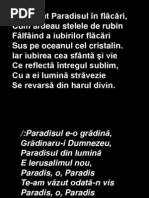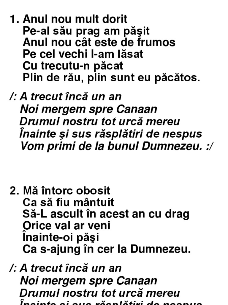 Anul nou mult dorit Pe-al su prag am pit Anul nou ct este de frumos Pe cel vechi l-am lsat Cu trecutu-n pcat Plin de ru, plin sunt eu pctos. /: A trecut nc un an Noi mergem spre Canaan Drumul nostru tot urc mereu nainte i sus rspltiri de nespus Vom primi de la bunul Dumnezeu. :/