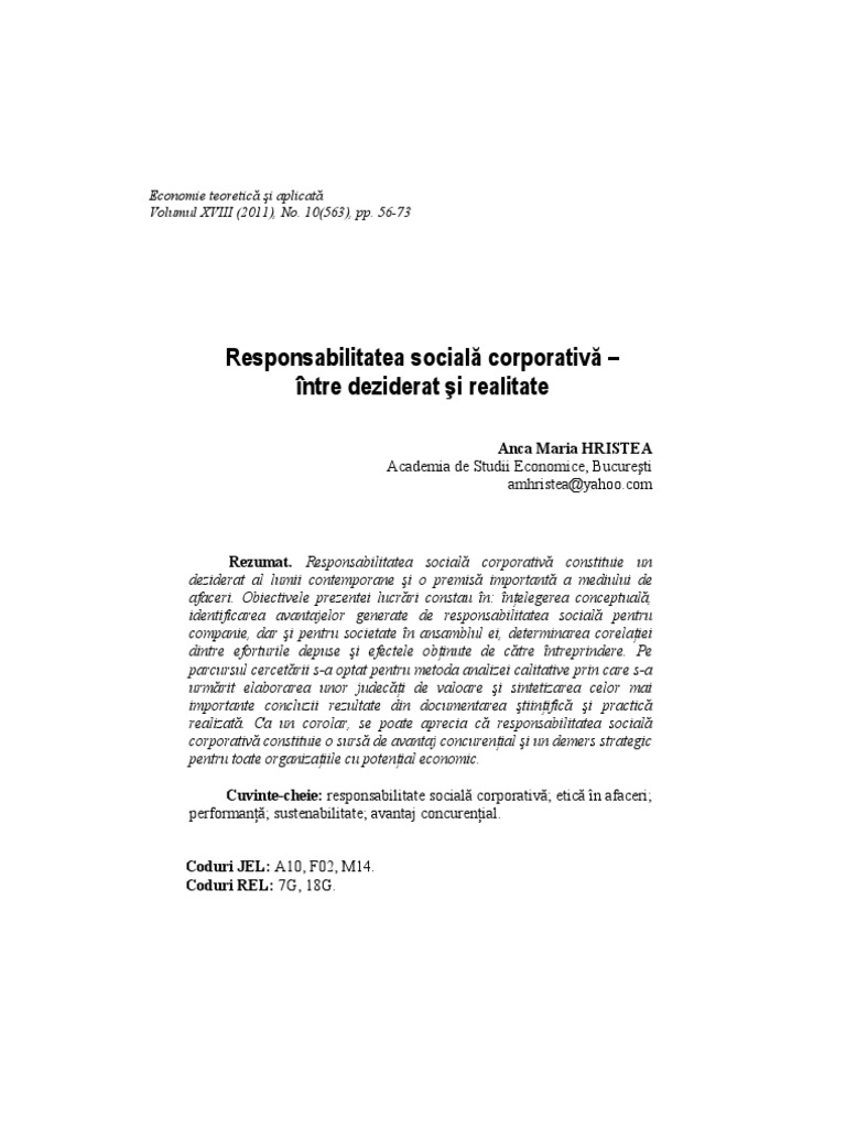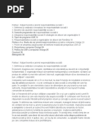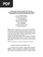 1. Introducere Responsabilitatea social corporativ(1) a devenit ncepnd cu anul 2000 unul din subiectele fierbini n domeniul afacerilor. Concept referitor la contribuia pe care companiile i-o aduc la dezvoltarea societii moderne, iniiativa responsabil a fost teoretizat de numeroase curente de gndire i a fost promovat printr-o mare diversitate de termeni: corporate citizenship, corporate philantropy, corporate societal marketing, community affairs, community development etc. Sprijinirea i respectarea drepturilor fundamentale ale omului, dreptul la libera asociere, eliminarea tuturor formelor de munc forat, combaterea corupiei, promovarea responsabilitii fa de mediul nconjurtor sunt doar cteva dintre principiile vizate de CSR. Pe scurt, se poate spune c responsabilitatea social corporatist este o modalitate de dezvoltare durabil prin care companiile aleg s trateze problemele de mediu i cele sociale ca pri integrante ale operaiunilor de afaceri. Att corporaiile, ct i mass media accept faptul c n relaiile dintre companii i comunitate responsabilitatea social este reciproc avantajoas. Pe de o parte, aceasta genereaz profit pentru companii, iar, pe de alt parte, CSR acord sprijin grupurilor sau comunitilor defavorizate i particip la dezvoltarea local. Aprut imediat dup al doilea rzboi mondial ca nou tendin n societatea postbelic, responsabilitatea social corporativ constituie n prezent un concept larg utilizat, un deziderat pentru orice companie care dorete s avanseze economic i social ntr-un context competiional devenit extrem de agresiv. Personaliti consacrate n domeniul managementului strategic i al marketing-ului (Friedman, Porter, Kotler .a.), profesori i cercettori tiinifici de renume, mass media i chiar managerii companiilor i-au adus n timp contribuii remarcabile la conturarea conceptual a fenomenului CSR, astfel c n prezent, studii recente i sondaje indic faptul c rspunderea social constituie un deziderat al marii majoriti a firmelor. Volumul mare de publicaii i articole pe aceast tem (cteva zeci de milioane de referine aprute n cteva secunde la o simpl accesare a internetului) confirm interesul manifestat de manageri, dar i de lumea tiinific pentru subiectul dezbtut. Mai mult ca niciodat, pe plan internaional exist importante preocupri pentru asigurarea unui echilibru ntre moral i interesul personal al companiilor. Creterea economic a unei companii nu presupune doar obinerea de profit, ci i reinvestirea acestuia. n orice afacere, este nevoie, pe lng capital financiar i de active, de resurse umane, iar n ultimii ani, tot mai mult, de un capital social creat din reputaie i ncredere. Abordarea strategic a CSR constituie o condiie a obinerii succesului n afaceri. nc vulnerabil pentru unii