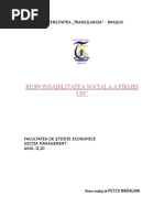 loiale; transparenei prin publicarea de rapoarte privind randamentul ntreprinderii; msuri anticorupie etc. Corporaiile transnaionale i cele multinaionale, denumite frecvent i companii globale, prin specificul lor juridic, trebuie s respecte legile statelor n care activeaz i s acorde ntotdeauna importan meninerii celor mai nalte standarde etice. n concluzie, dei responsabilitatea social corporativ se impune tot mai mult ca o necesitate pentru lumea de afaceri, un cadru de reglementare care s induc obligaii juridice de implementare nu exist; n plus, etica n afaceri este un etalon i pentru CSR, iar companiile implicate n astfel de proiecte se afl sub jurisdicia statelor gazd. Conform studiului on line Transparena i credibilitatea n practicile de responsabilitate social corporatist(5), publicat la nceputul anului 2010 de [Link], 76% din repondenii sondajului susin c firmele lor au coduri etice, iar 87% au rspuns c societile n care activeaz investesc social. 3. Justificarea economic a responsabilitii sociale corporative Majoritatea studiilor au identificat o relaie cert, nu ntotdeauna direct proporional, ntre activitile de CSR i performanele companiei evaluate, msurat prin intermediul unor indicatori specifici precum cifra de afaceri, profitul, profitul pe aciune sau impactul de marketing. n opinia specialitilor, justificarea economic a CSR difer de la caz la caz, n funcie de diveri factori: dimensiunea societii, activitile desfurate, oferta de produse sau servicii, amplasamentul, conducerea, reputaia, furnizorii sau importana sectorului de activitate. ntre responsabilitatea social i succesul unei ntreprinderi se stabilete un puternic consens. Se constat statistic c acele companii care nu implic n activitile lor considerente sociale i ecologice nu pot rmne competitive; se impune deci adaptarea continu a msurilor strategice la cerinele pieei i ale societii, noile mize ale omenirii trebuind s devin factori cheie ai succesului ntr-o lume a interdependenelor i a luptei pentru supremaie. World Business Council of Sustainable Development a evideniat faptul c o strategie coerent n domeniul CSR, bazat pe integritate, valori solide i o abordare pe termen lung, confer ntreprinderilor avantaje comerciale importante i contribuie la bunstarea societii civile. Obiectivul oricrei