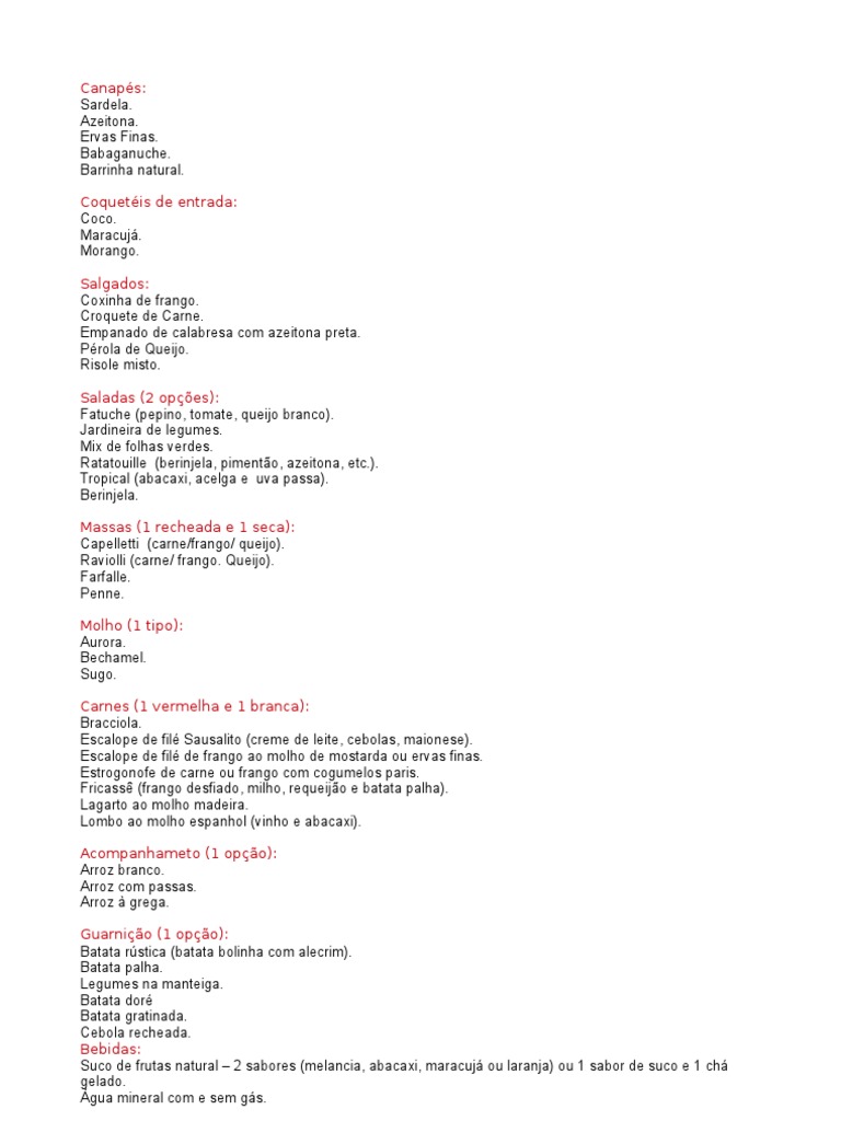 Salgados: Coxinha de frango. Croquete de Carne. Empanado de calabresa com azeitona preta. Prola de Queijo. Risole misto. Saladas (2 opes): Fatuche (pepino, tomate, queijo branco). Jardineira de legumes. Mix de folhas verdes. Ratatouille (berinjela, pimento, azeitona, etc.). Tropical (abacaxi, acelga e uva passa). Berinjela. Massas (1 recheada e 1 seca): Capelletti (carne/frango/ queijo). Raviolli (carne/ frango. Queijo). Farfalle. Penne. Molho (1 tipo): Aurora. Bechamel. Sugo. Carnes (1 vermelha e 1 branca): Bracciola. Escalope de fil Sausalito (creme de leite, cebolas, maionese). Escalope de fil de frango ao molho de mostarda ou ervas finas. Estrogonofe de carne ou frango com cogumelos paris. Fricass (frango desfiado, milho, requeijo e batata palha). Lagarto ao molho madeira. Lombo ao molho espanhol (vinho e abacaxi). Acompanhameto (1 opo): Arroz branco. Arroz com passas. Arroz grega. Guarnio (1 opo): Batata rstica (batata bolinha com alecrim). Batata palha. Legumes na manteiga. Batata dor Batata gratinada. Cebola recheada. Bebidas: Suco de frutas natural 2 sabores (melancia, abacaxi, maracuj ou laranja) ou 1 sabor de suco e 1 ch gelado. gua mineral com e sem gs.