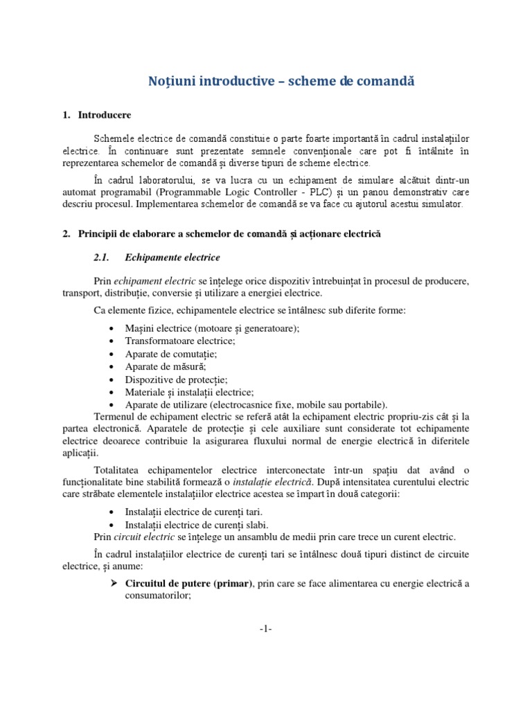 1. Introducere Schemele electrice de comand constituie o parte foarte important n cadrul instalaiilor electrice. n continuare sunt prezentate semnele convenionale care pot fi ntlnite n reprezentarea schemelor de comand i diverse tipuri de scheme electrice. n cadrul laboratorului, se va lucra cu un echipament de simulare alctuit dintr-un automat programabil (Programmable Logic Controller - PLC) i un panou demonstrativ care descriu procesul. Implementarea schemelor de comand se va face cu ajutorul acestui simulator. 2. Principii de elaborare a schemelor de comand i acionare electric 2.1. Echipamente electrice