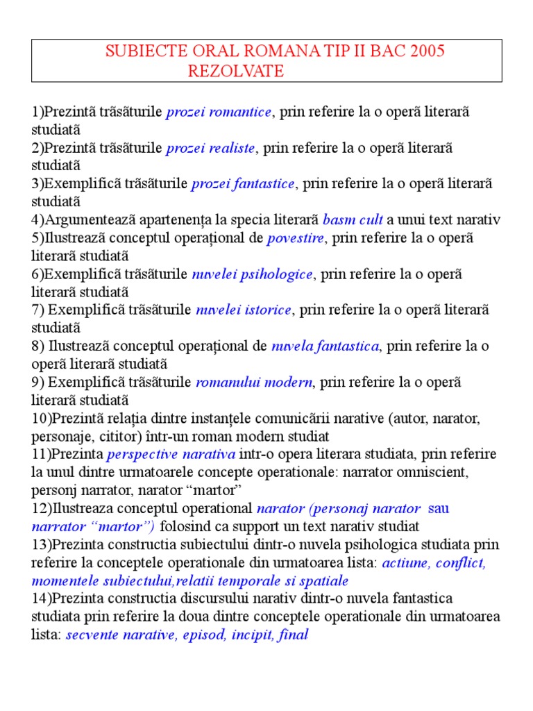 SUBIECTE ORAL ROMANA TIP II BAC 2005