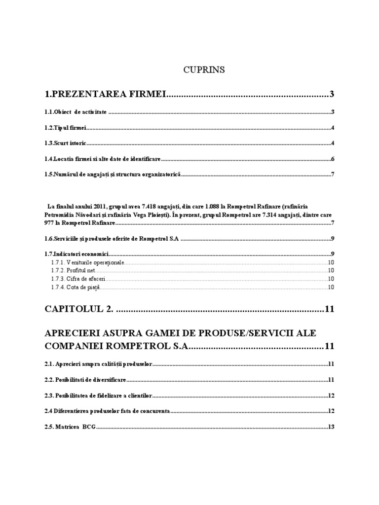 CAPITOLUL 2. ....................................................................................11 APRECIERI ASUPRA GAMEI DE PRODUSE/SERVICII ALE COMPANIEI ROMPETROL S.A......................................................11