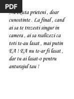 Lasa-ma cu alea alea, vine altul si tu VALEAAA ! :) M-ai pierdut si nu mi-ai dat de ales.A venit altul acum,mult mai bun [Link] fata asta vrei tu sa te iubesc? Asta e singurul lucru la care ma gandesc :) Esti sters si derulat de la [Link] care ti-a fost acordat,a expirat ! Ne-am indragostit ca dracu,Eu de tine , tu de alta . :) Tu o sa-ti gasesti pe alta ca sa [Link] o sa-mi bat joc de altul ca sa-mi aduc aminte :> Tine de tine pe unde umblii si cu [Link] te [Link]-mi cand trebuie sa ajungi ca sa stiu cand sa plec :) . De ceva timp e si la mine cum e vorba aia "Mortii cu mortii si vii cu vii".Asa ca eu sunt cu vii mei,iar el cu mortii lui . :) Nu incerca sa minti cum ca ea e doar o oarecare,Cand ei stiu ca amintirea ei inca te [Link] ca din partea ta femeile pot ,pleca ca au fost multe-n patul tau dar nu si in inima ta. Nu ma judeca prea tare Ca nu esti in stare Sa ma ti langa tine Si iti da EROARE.N-o sa-ti spun "Mai stai!" E tarziu Bye Bye :) ?Nu faci [Link] impresia ca eu stau sa te [Link] defapt eu ma indepartez [Link] uiti atent,ma privesti cu regret,asupra mea nu vei mai avea nici un efect? :) Acum ar trebui sa stii mai clar ce [Link] are de pierdut,tu esti OK:x E destul cat am avut rabdare,Nu-ti permit eu tie sa-mi calci viata-n picioare,Ai pierdut tot ce-ai avut [Link] regret,ca n-am ce regreta. Acum regreti si tu si eu insa eu mai putin,caci acum un alt baiat pe drum de mana [Link] m-a facut sa [Link] sper,sa cred in vise,Ceea ce tu mi-ai interzis mi-a deschis porti inchise. :) Cu indiferenta ta m-ai facut mai tare,Acum nu-ti convine Dar incet incet calc pe urmele tale Si abia acum vezi si tu ca indiferenta doare.