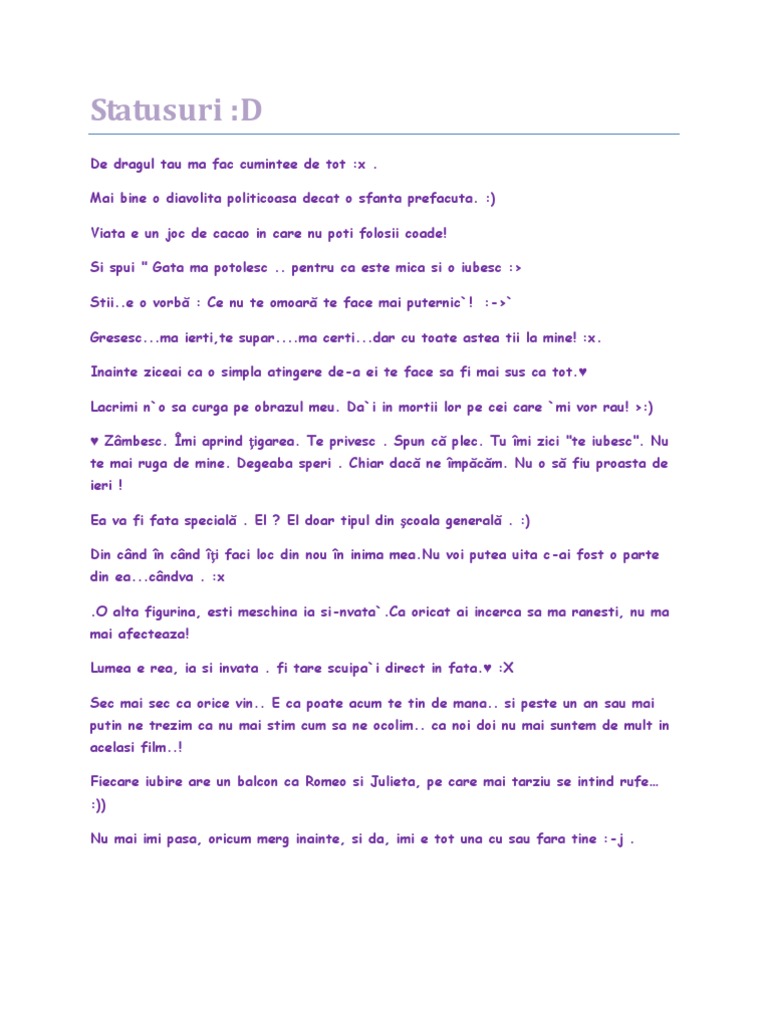 #Suntem genul de fete care tim ce-nseamn distracia , prietenia adevrat , i cum e s suferi cteodat! Am fost i suntem mereu mpreun , pentru c suntem normale ntr-o lume nebun! De ce in felul sta? Pentru ca aa sunt. Aa am fost mereu, dar nu am avut de ce s le arat i altora ce scorpie sunt eu! >:) Viaa nseamn risc . :> Deciii , haii risc i iubete-m ! ;x . Te-am cunoscut intr-o vara,banal .Da' nu pe plaja,la [Link] pe banca pe mal,nu la vre-un bar. 8-> ntre noi firul s-a rupt baby , permanent !! >:) Vreau 2000 de pahare de [Link] seara asta nu ajung acasa bai vere!!!Ca totu.n jurul meu mi se pare un miraj...iar dimineatsa...dispar din peisaj! :X Baiatul: Eti prea dragu pentru a fii singur . :-* Fata: Nu, sunt prea dragu pentru a fii inelat,minit i apoi prsit :p El: Craciun fericit iubita! Ea: Da,[Link] voi avea! :x -Ai incredere in ea ? - Da . - Ai incredere in ea sau vrei s-o vezi plecata ? - Vreau sa o vad plecata ..Doar ca sa o prind de mana si sa o aduc inapoi :x Biatul - Doar spune-mi unde i este cel mai bine i am s fac tot posibilul s te duc acolo. Fata - Nu e nevoie, iubire, sunt deja acolo : n braele tale! Ea: De ce ma urmaresti? El: Pt ca mama mi`a spus mereu sa`mi urmaresc visurile ...iar visul meu esti tu :x