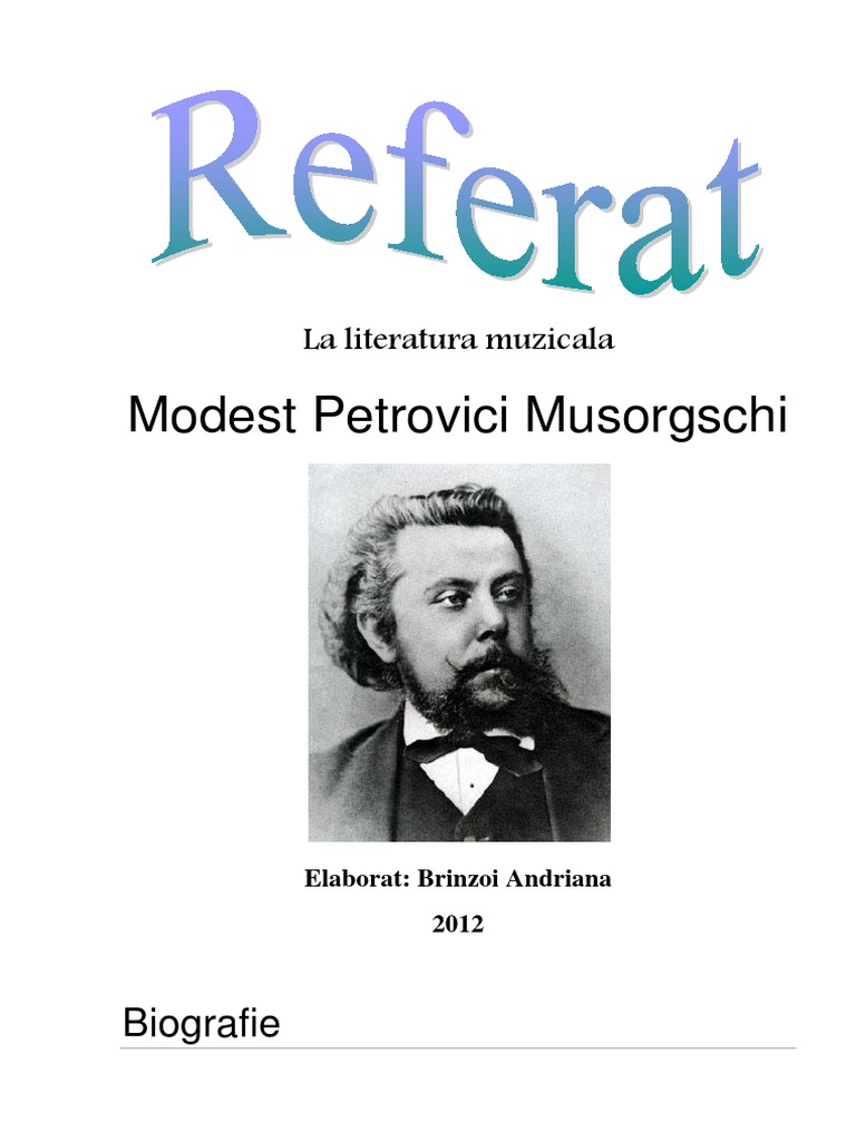 Modest Musorgski aparinea Grupului Celor Cinci (alturi de Mili Balakirev, Cesar Kui, Nikolai Rimski-Korsakov i Alexandr Porfirievici Borodin) cunoscui ca inovatorii muzicii ruse. Creaiile sale au nscris muzica de oper rus pe linia operei cu caracter naional. Musorgski s-a folosit n creaiile sale de piesele lui Nikolai Gogol ("Cstoria" i "Trgul din Sorocinsk") i de tragedia lui Pukin "Boris Godunov", lucrare dup care muzicianul a compus opera cu acelai nume. Musorgski a fost primul dintre aceti artiti care a produs o capodoper. Era cel mai original i mai puin inclinat spre compromisuri. In anul 1868 a nceput s lucreze la capodopera sa, Boris Godunov, ns aceasta nu avea o aciune propriuzis, ci era mai degraba o serie de procesiuni. Este terminat n 1869, dup cincisprezece luni de munc. Din pcate, partitura a fost respins de conducerea unor case de oper i a unor teatre, din diverse motive, printre care i acela c nu avea un personaj principal feminin. Lucrarea va fi revizuit i terminat abia n 1874. "Tablouri dintr-o expoziie" (copert)