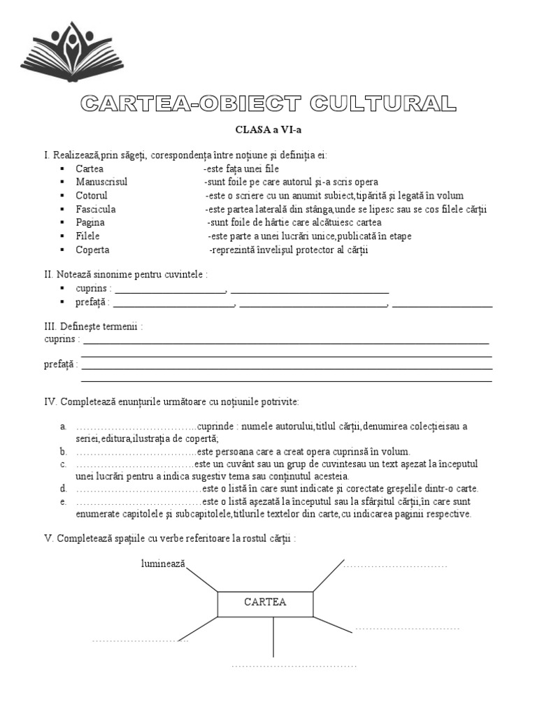 Realizeaz,prin sgei, corespondena ntre noiune i definiia ei: Cartea -este faa unei file Manuscrisul -sunt foile pe care autorul i-a scris opera Cotorul -este o scriere cu un anumit subiect,tiprit i legat n volum Fascicula -este partea lateral din stnga,unde se lipesc sau se cos filele crii Pagina -sunt foile de hrtie care alctuiesc cartea Filele -este parte a unei lucrri unice,publicat n etape Coperta -reprezint nveliul protector al crii II. Noteaz sinonime pentru cuvintele : cuprins : _____________________, ______________________________ prefa : _______________________, ____________________________, ___________________ III. Definete termenii : cuprins : _____________________________________________________________________________ ______________________________________________________________________________ prefa : ______________________________________________________________________________ ______________________________________________________________________________ IV. Completeaz enunurile urmtoare cu noiunile potrivite: a. ..cuprinde : numele autorului,titlul crii,denumirea colecieisau a seriei,editura,ilustraia de copert; b. ..este persoana care a creat opera cuprins n volum. c. .este un cuvnt sau un grup de cuvintesau un text aezat la nceputul unei lucrri pentru a indica sugestiv tema sau coninutul acesteia. d. este o list n care sunt indicate i corectate greelile dintr-o carte. e. este o list aezat la nceputul sau la sfritul crii,n care sunt enumerate capitolele i subcapitolele,titlurile textelor din carte,cu indicarea paginii respective. V. Completeaz spaiile cu verbe referitoare la rostul crii : lumineaz CARTEA .