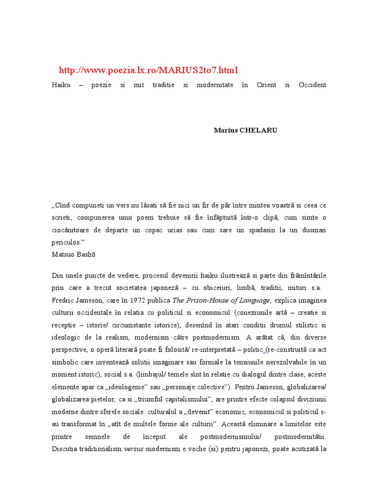 Cnd compuneti un vers nu lsati s fie nici un fir de pr ntre mintea voastr si ceea ce scrieti; compunerea unui poem trebuie s fie nfptuit ntr-o clip, cum simte o ciocnitoare de departe un copac urias sau cum sare un spadasin la un dusman periculos. Matsuo Bash Din unele puncte de vedere, procesul devenirii haiku ilustreaz si parte din frmntrile prin care a trecut societatea japonez cu obiceiuri, limb, traditii, mituri s.a. Fredric Jameson, care n 1972 publica The Prison-House of Language, explica imaginea culturii occidentale n relatia cu politicul si economicul (conexiunile art creatie si receptie istorie/ circumstante istorice), desennd n atari conditii drumul stilistic si ideologic de la realism, modernism ctre postmodernism. A artat c, din diverse perspective, o oper literar poate fi folosit/ re-interpretat politic (re-construit ca act simbolic care inventeaz solutii imaginare sau formale la tensiunile nerezolvabile n un moment istoric), social s.a. (limbajul/ temele snt n relatie cu dialogul dintre clase; aceste elemente apar ca ideologeme sau personaje colective). Pentru Jameson, globalizarea/ globalizarea pietelor, ca si triumful capitalismului, are printre efecte colapsul diviziunii moderne dintre sferele sociale: culturalul a devenit economic, economicul si politicul sau transformat n att de multele forme ale culturii. Aceast eliminare a limitelor este printre semnele de nceput ale postmodernismului/ postmodernittii. Discutia traditionalism versus modernism e veche (si) pentru japonezi, poate acutizat la